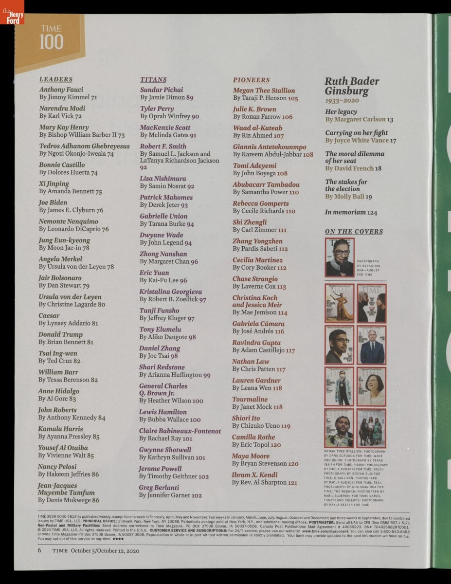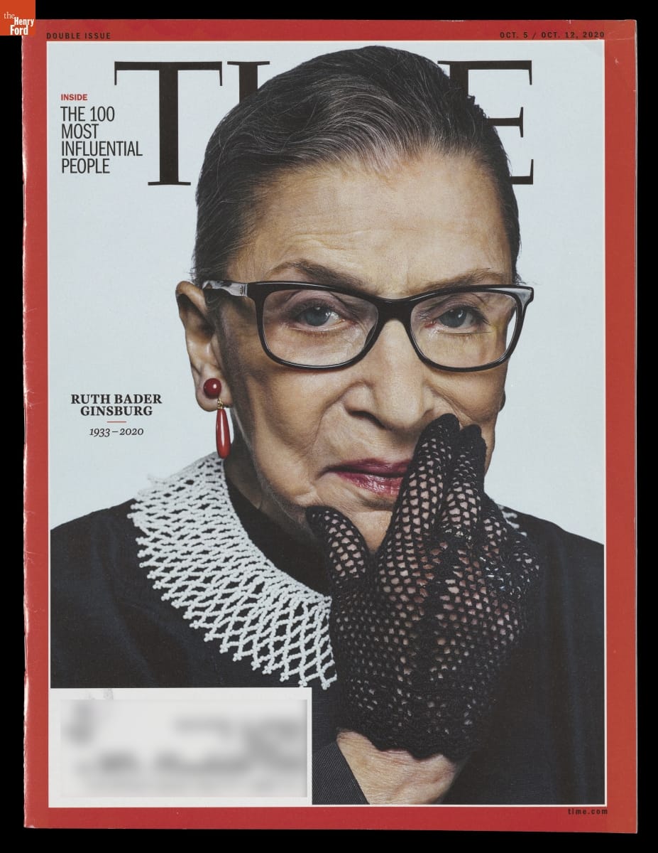 This Time magazine cover honors Ruth Bader Ginsburg, who served on the Supreme Court from 1993 until her death in 2020 at age 87. She was known for advocating for women's rights, uniting the liberal justices, and wearing bejeweled collars over her judicial robes. This cover portrait features her famous "dissent collar," often worn when she disagreed with the Court's decision.