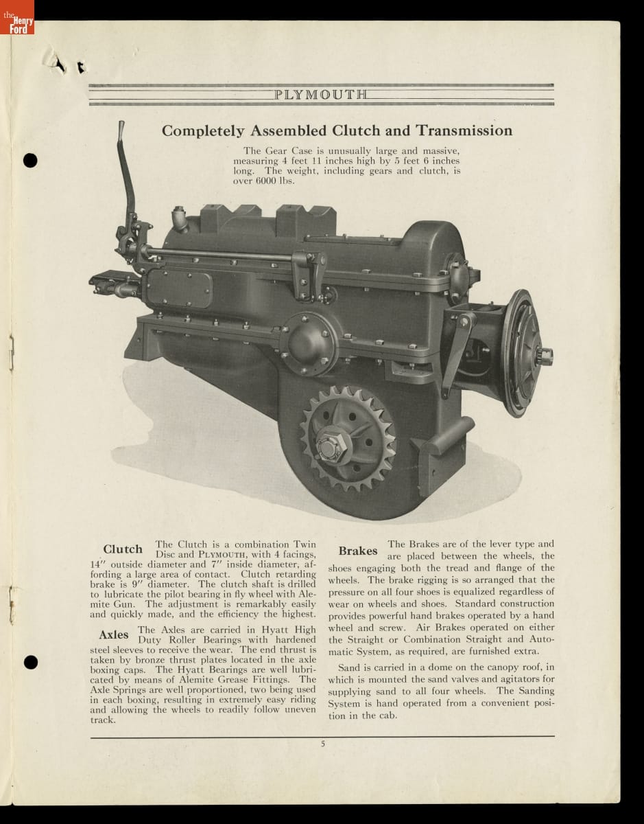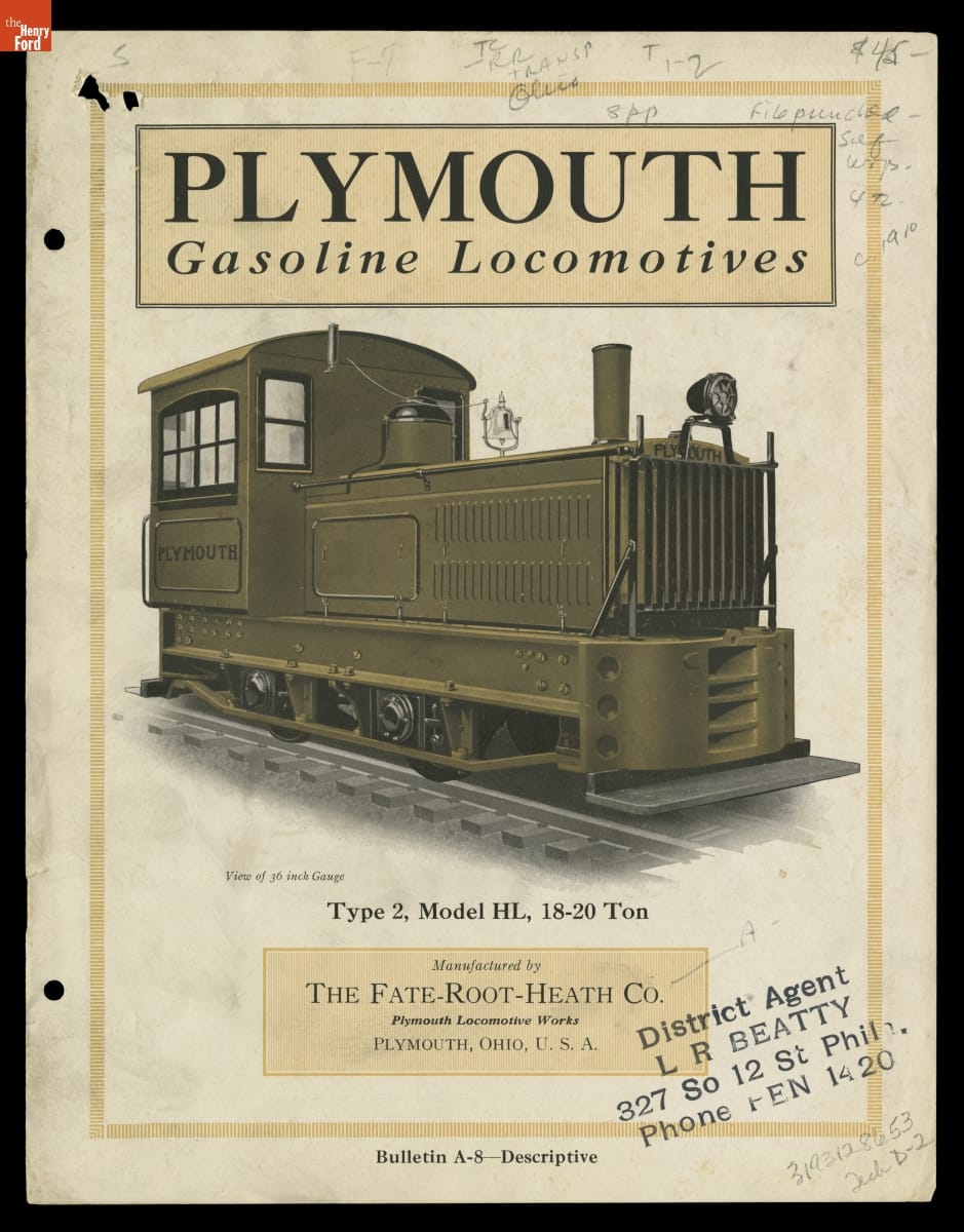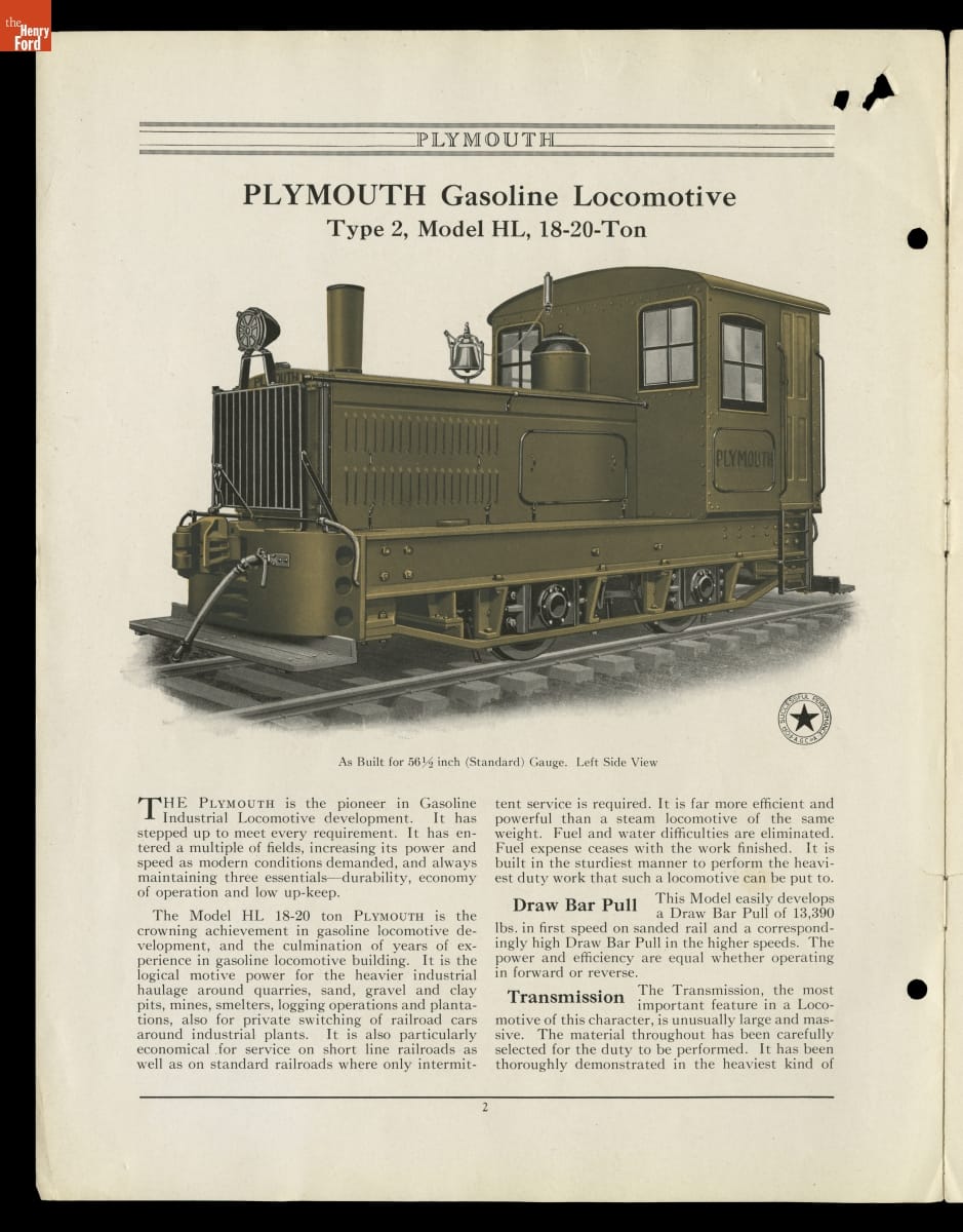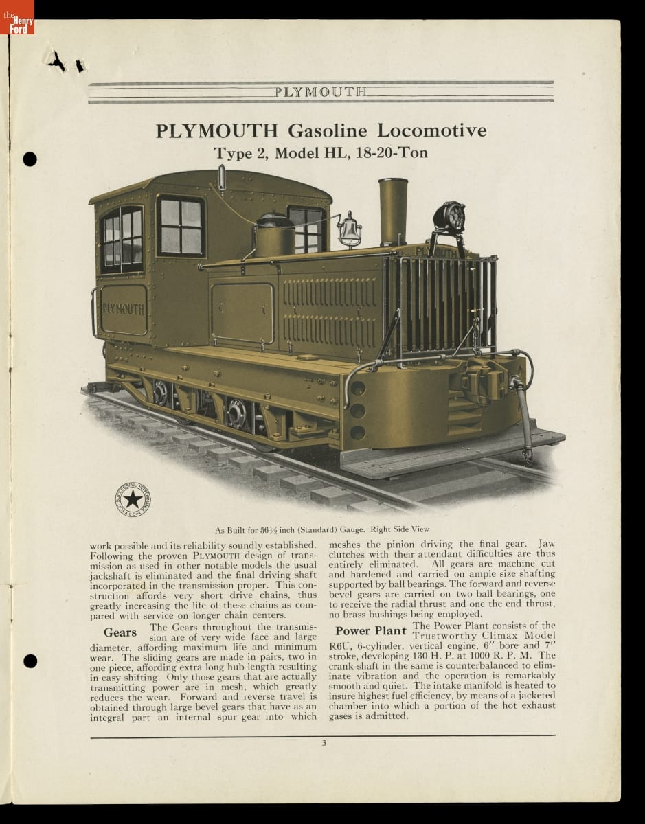 Plymouth industrial locomotives were designed for places like mines, mills, factories, agricultural operations, and construction sites. All early Plymouth locomotives were distinguished by their use of gasoline-fueled, internal combustion engines and mechanical drivetrains -- similar to the engines and drivetrains used in automobiles. Plymouth later added conventional diesel-electric locomotives to its product lineup.