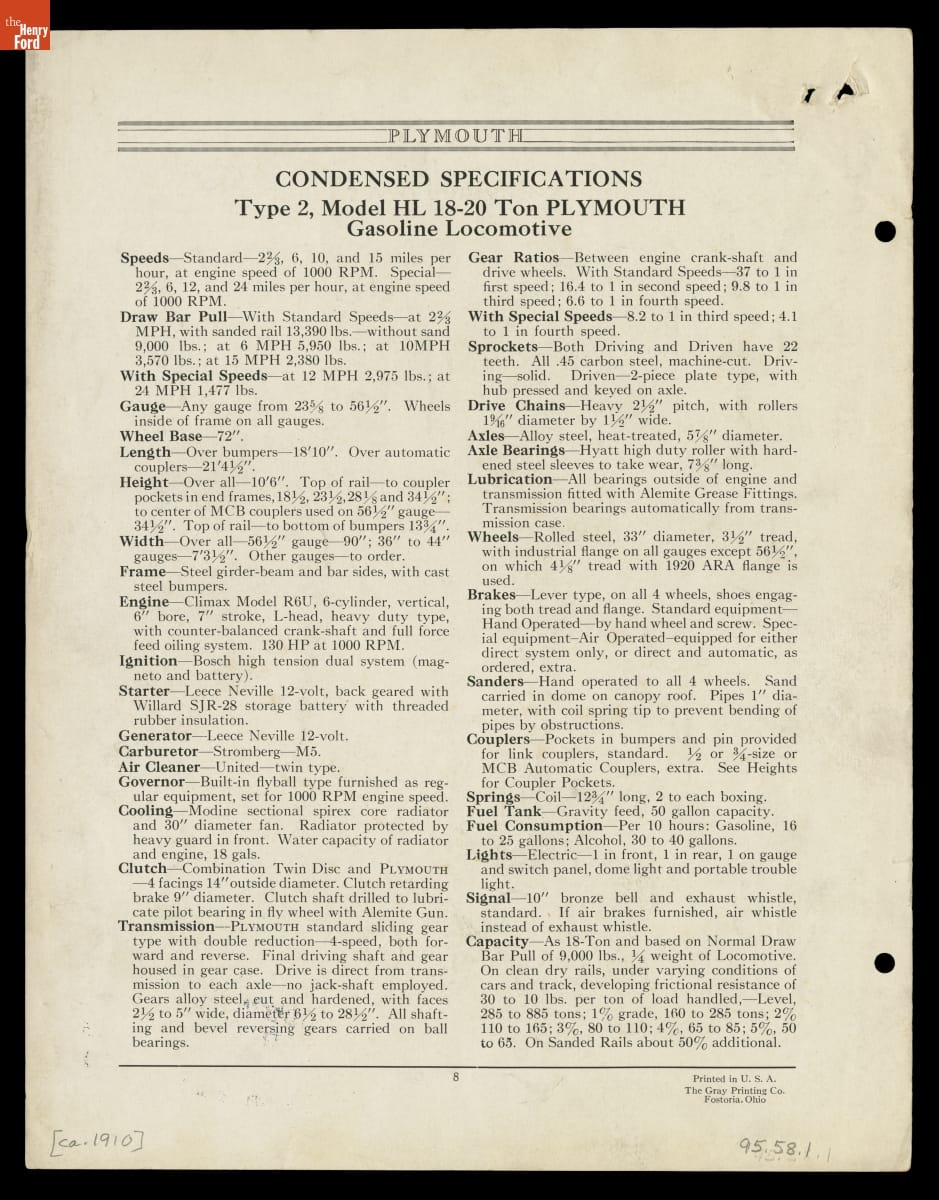 Plymouth Gasoline Locomotives, Type 2, Model HL, 18-20 Ton, circa 1910