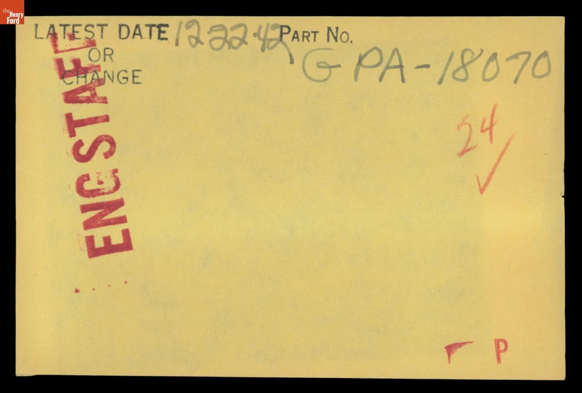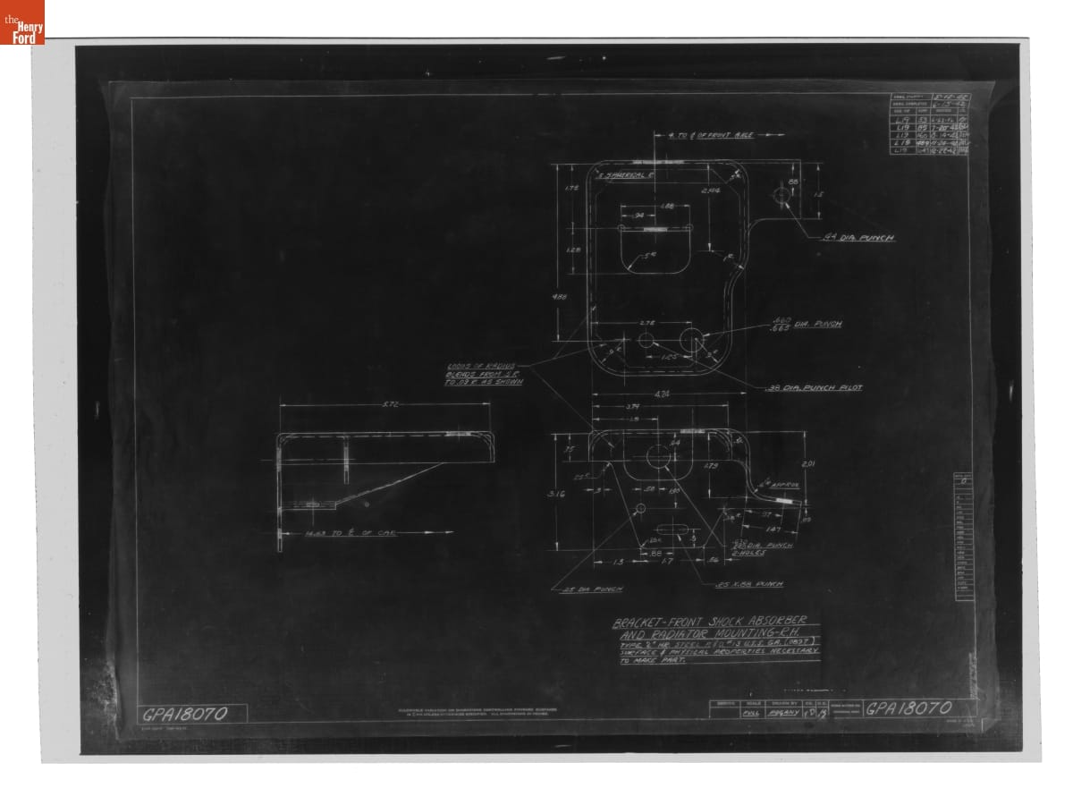 The Ford Motor Company created over a million parts drawings from 1903 to 1957. Many of these drawings specify engineering requirements for the components of Ford-made vehicles--including automobiles, trucks, tractors, military vehicles and Tri-motor airplanes. Others document assembly components, stages of casting and forging, or experimental designs. Beginning in the 1940s, Ford transferred the drawings to microfilm.