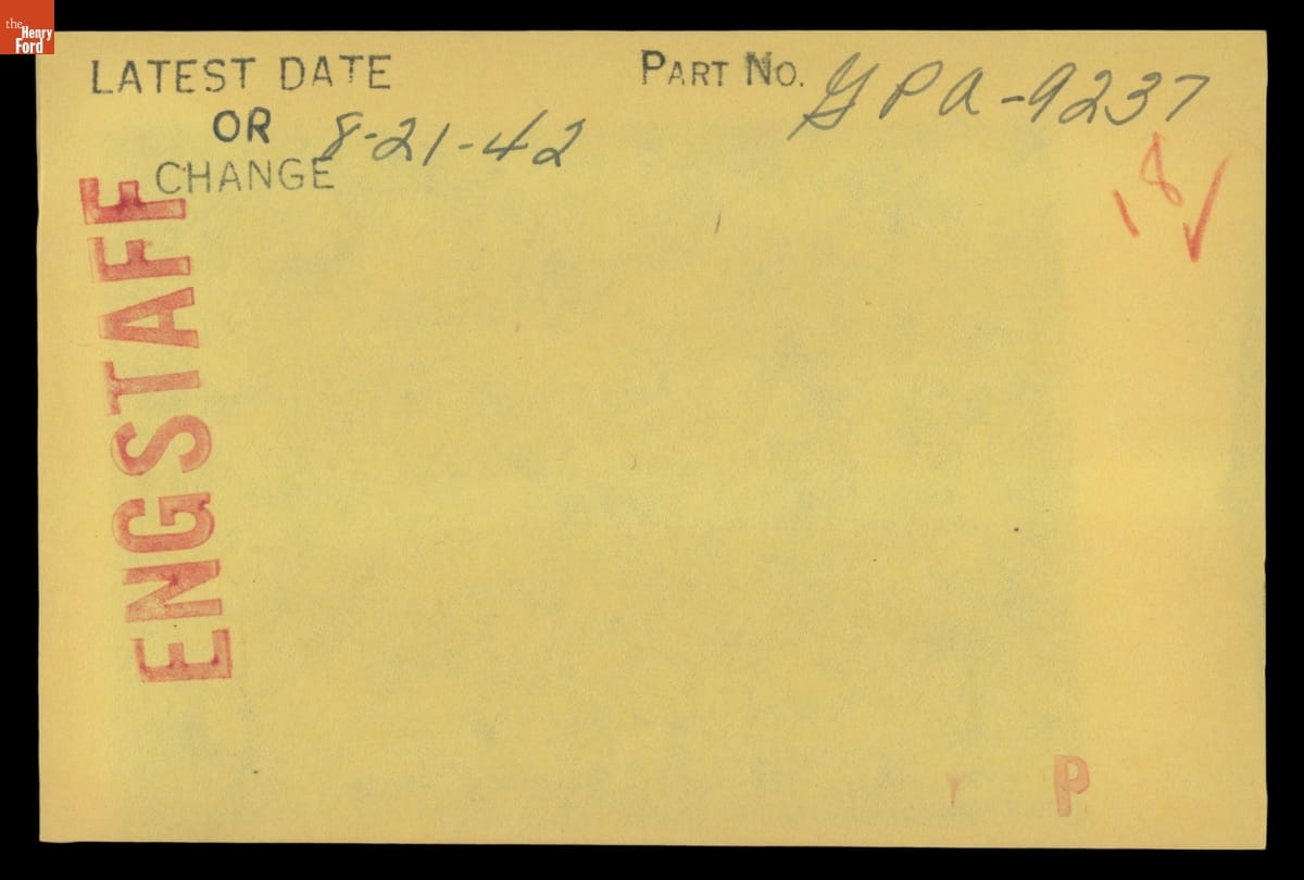 The Ford Motor Company created over a million parts drawings from 1903 to 1957. Many of these drawings specify engineering requirements for the components of Ford-made vehicles--including automobiles, trucks, tractors, military vehicles and Tri-motor airplanes. Others document assembly components, stages of casting and forging, or experimental designs. Beginning in the 1940s, Ford transferred the drawings to microfilm.