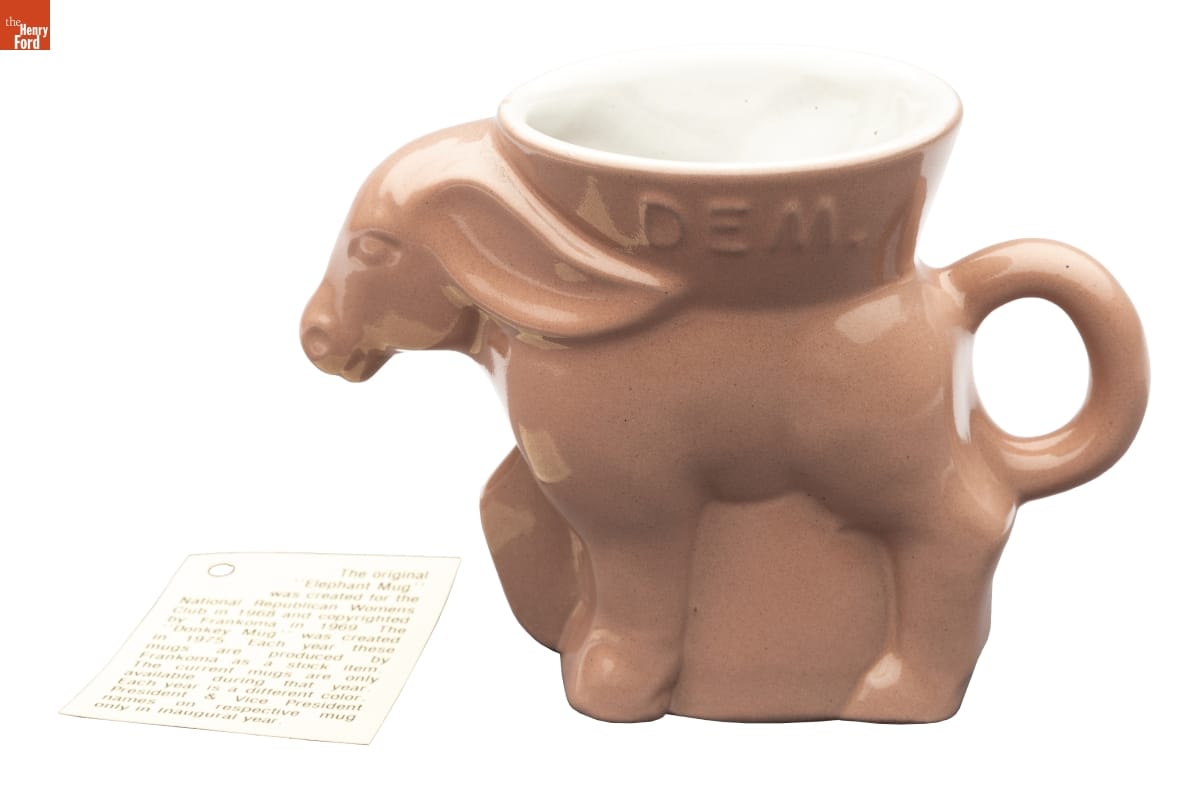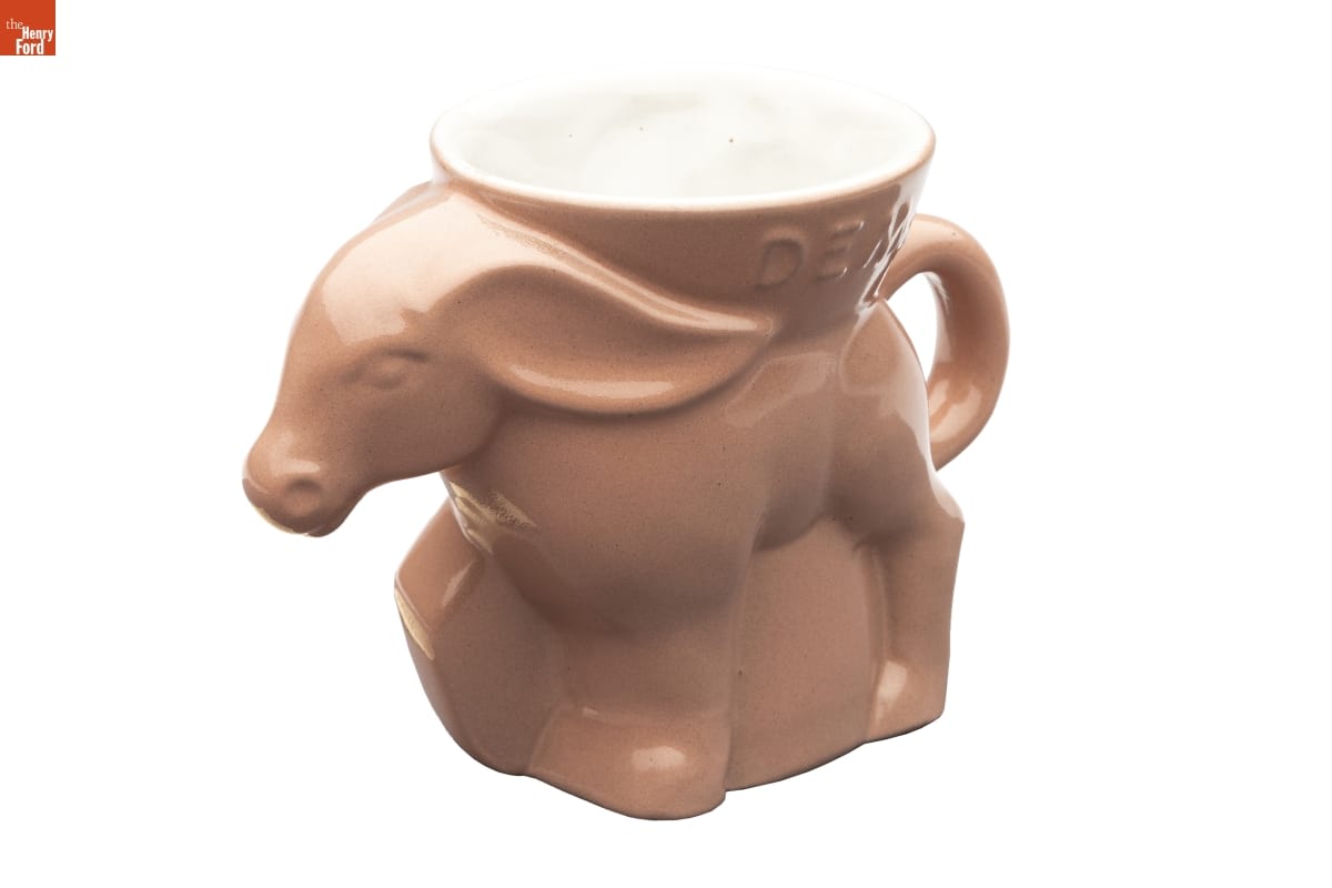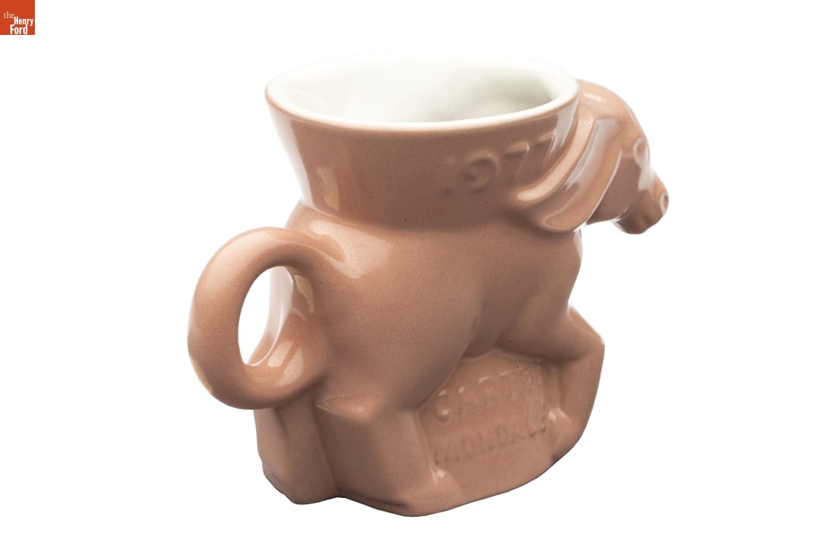 John Frank, head of the ceramics department at the University of Oklahoma, and his wife Grace Lee established Frankoma Pottery in 1933. They used native clays of Oklahoma to create their Southwestern-inspired wares. But the Franks also successfully developed new lines of commemorative pieces that became sought-after collectibles. The company made this political party mug celebrating the 1977 inauguration of President Carter.