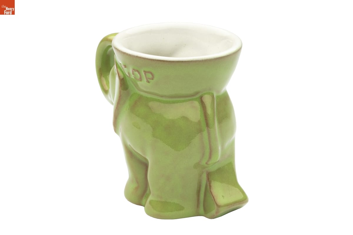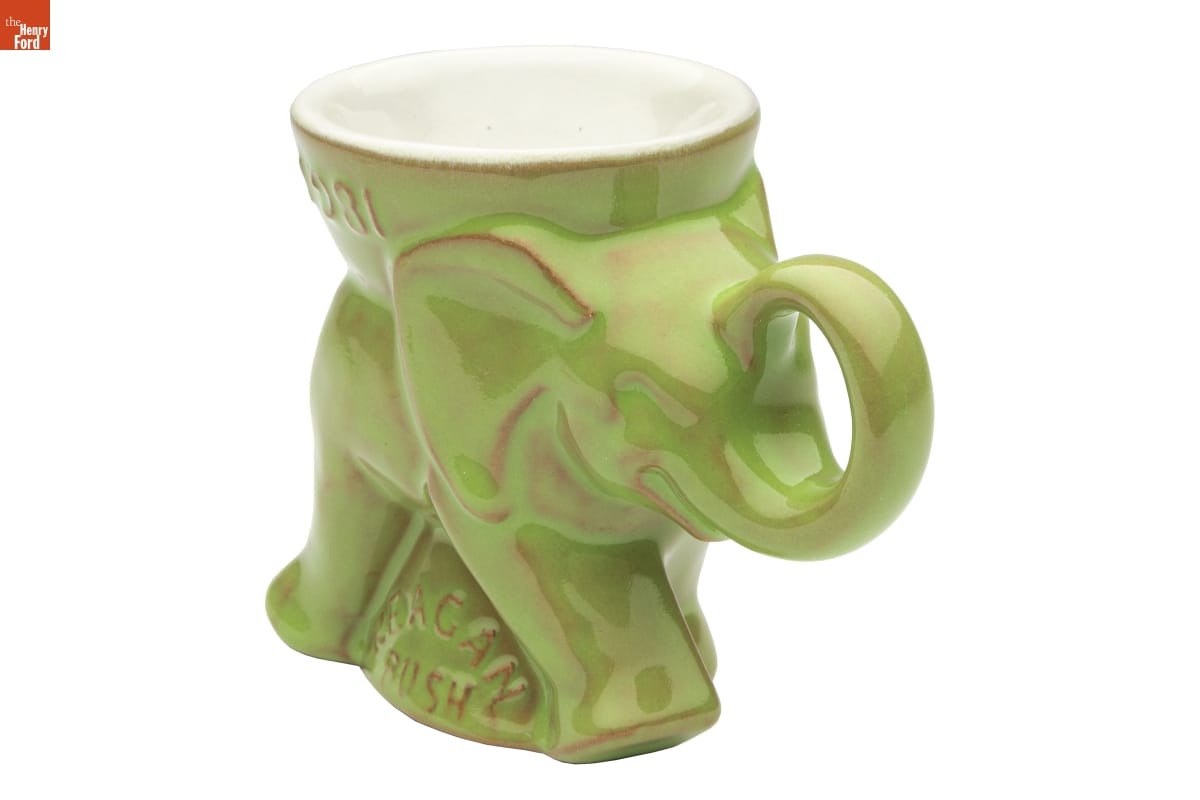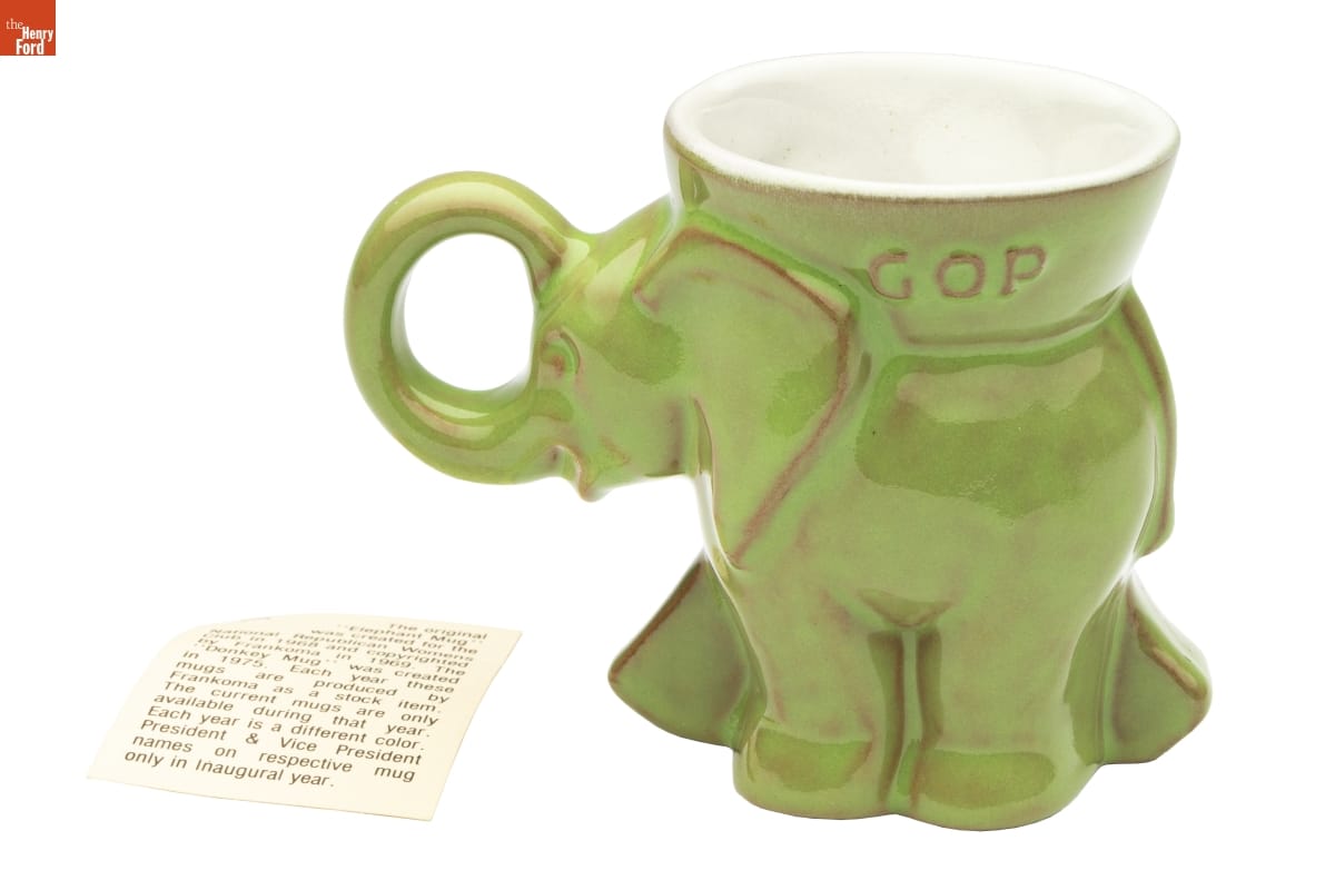 John Frank, head of the ceramics department at the University of Oklahoma, and his wife Grace Lee established Frankoma Pottery in 1933. They used native clays of Oklahoma to create their Southwestern-inspired wares. But the Franks also successfully developed new lines of commemorative pieces that became sought-after collectibles. The company made this political party mug celebrating the 1981 inauguration of President Reagan.