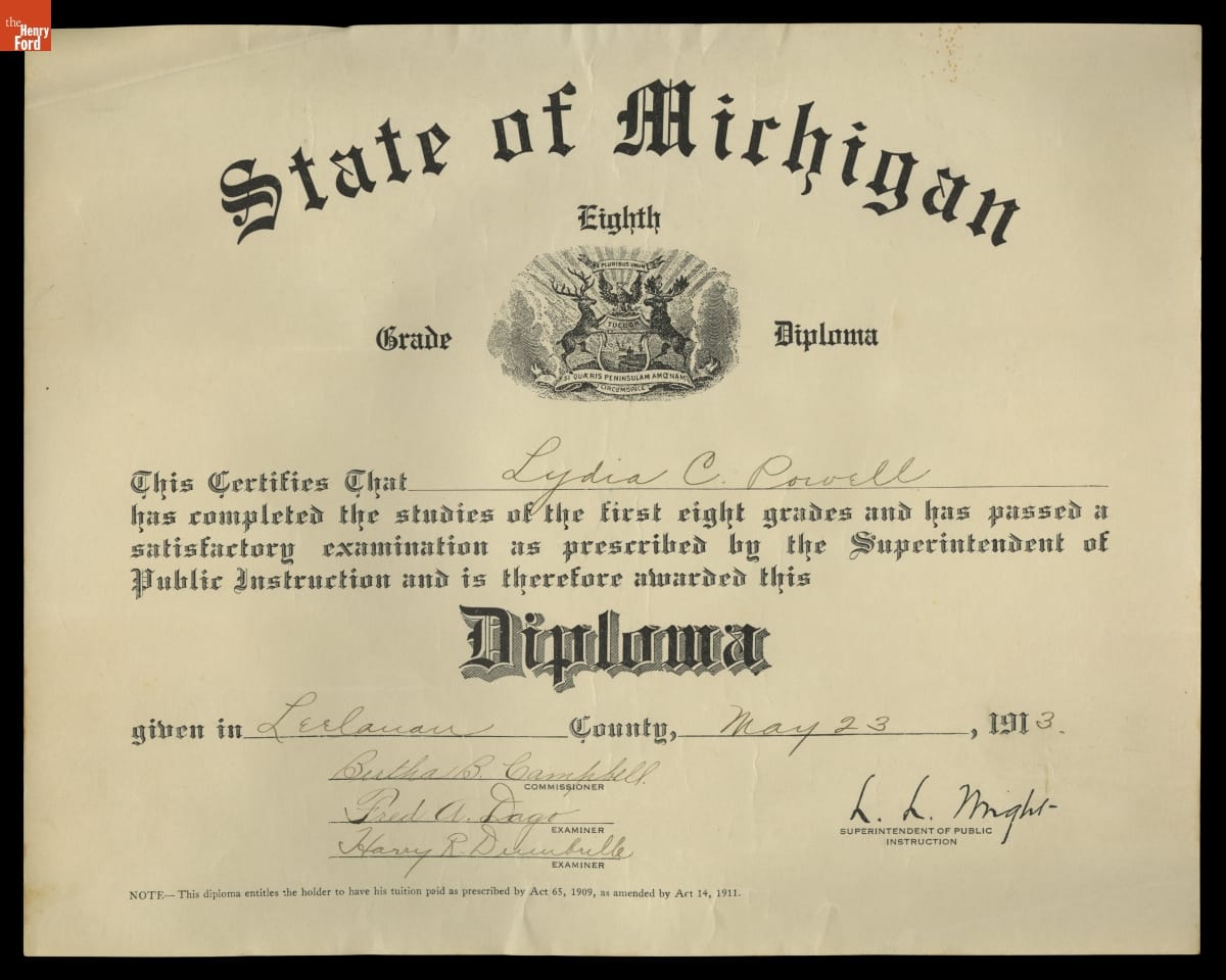 State of Michigan Eighth Grade Diploma Awarded to Lydia C. Powell, May 23, 1913