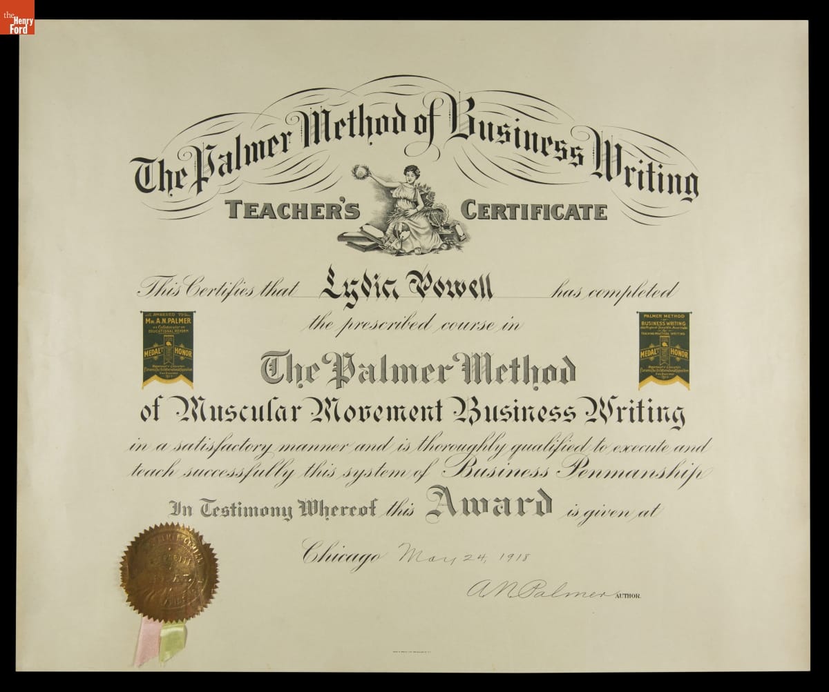 The Palmer Method of Business Writing Teacher's Certificate Awarded to Lydia Powell, May 24, 1918