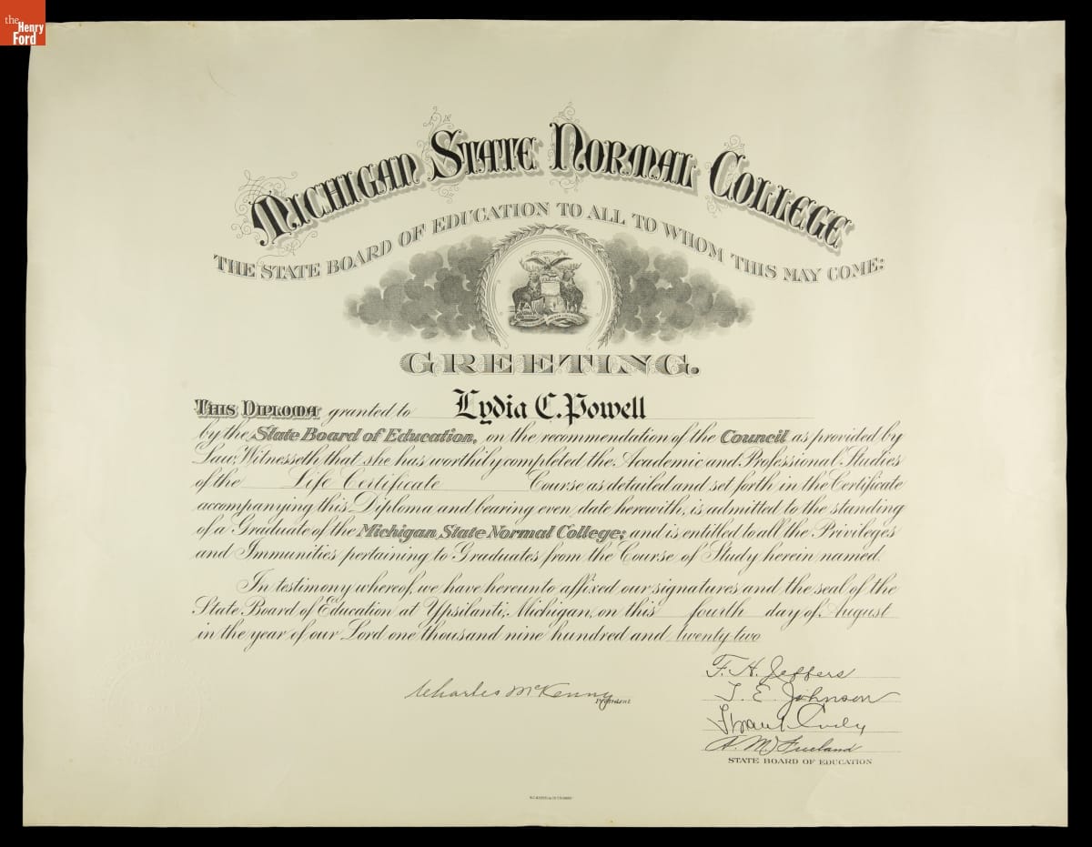 Michigan State Normal College Diploma Awarded to Lydia C. Powell, August 4, 1922
