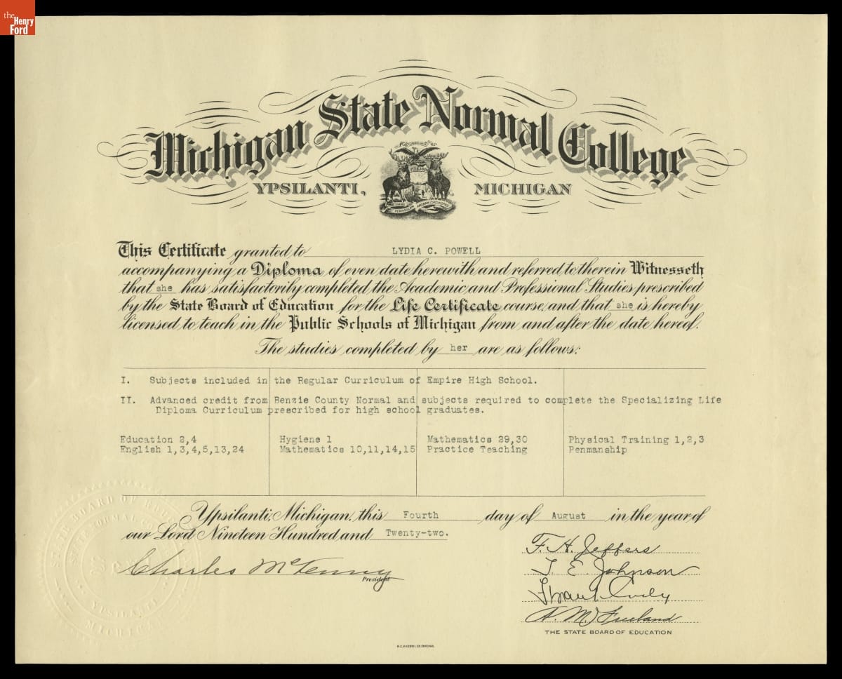 Michigan State Normal College Certificate Granted to Lydia C. Powell, August 4, 1922