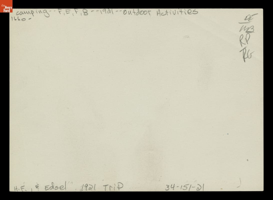 The Vagabonds (Henry Ford, Thomas Edison, Harvey Firestone, and John Burroughs) camped in style. In 1921, the famous men and their families vacationed comfortably at a remote campsite in Maryland. They were accompanied by a caravan of vehicles, full service staff, specially designed cooking and electrical equipment, and a player piano brought from nearby Hagerstown to enliven evening festivities.