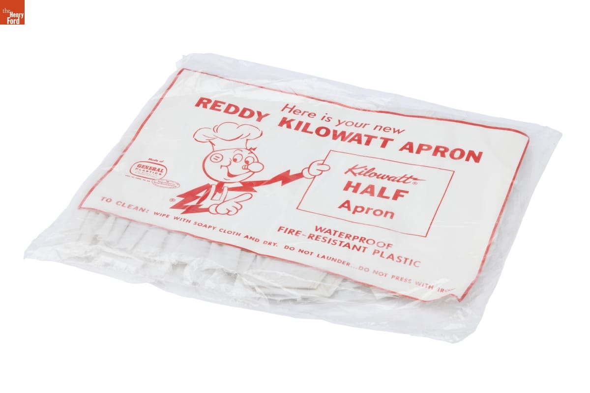Here is your new / REDDY KILOWATT APRON / Kilowatt(R) / HALF / Apron / Made of / GENERAL PLASTICS / The General Tire / & Rubber Company / WHICH HAS EARNED THIS SEAL / REPLACEMENT OR REFUND OF MONEY / Guaranteed by / Good Housekeeping / IF NOT AS ADVERTISED THEREIN / WATERPROOF / FIRE-RESISTANT PLASTIC / TO CLEAN: WIPE WITH SOAPY CLOTH AND DRY. DO NOT LAUNDER...DO NOT PRESS WITH IRON.