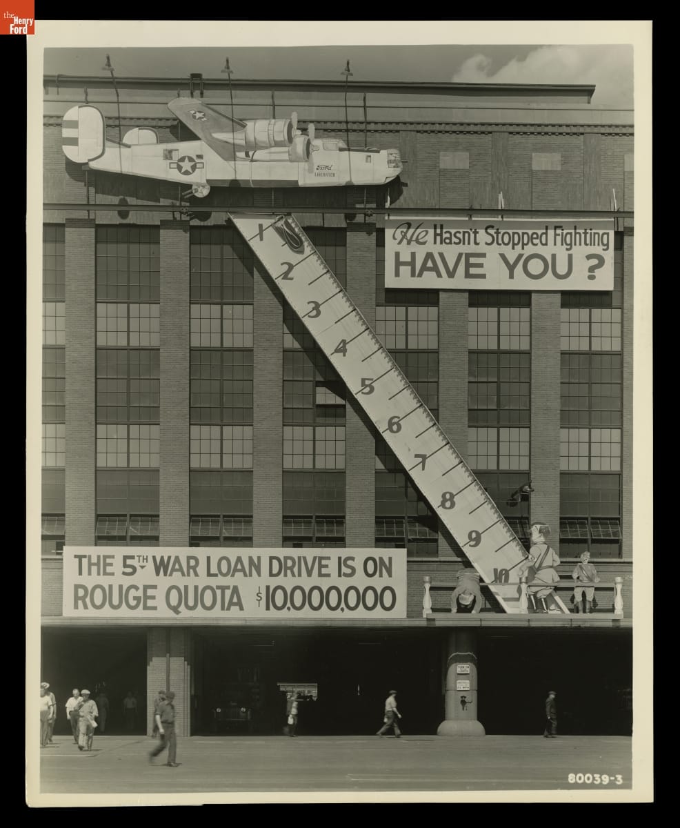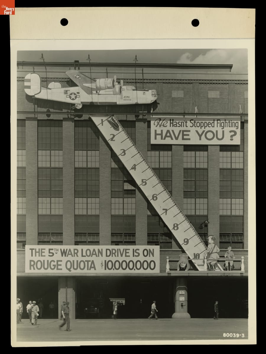 Sign for War Bond Drive outside the Press Shop at Ford Motor Company Rouge Plant, June 1944