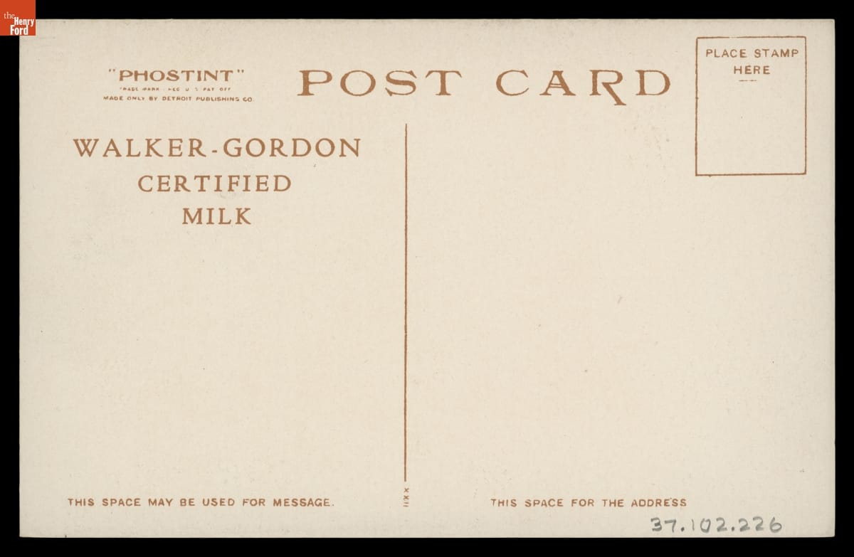 The Detroit Creamery Milk Farm produced milk for the Detroit area from 1910 until 1929. At its peak, it was the second largest milk farm in the country, with 2,300 acres and over 900 cattle. Their milk was certified by the Walker-Gordon milk laboratory, demonstrating its safety and purity. Souvenir postcards showcased the modern cleanliness of the Clinton Township farm.