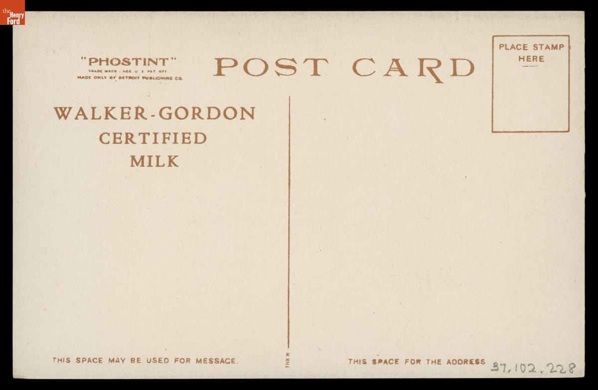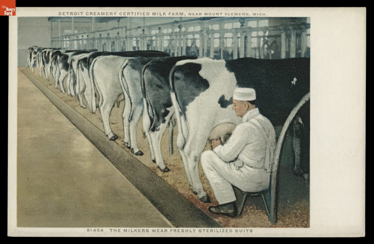 The Detroit Creamery Milk Farm produced milk for the Detroit area from 1910 until 1929. At its peak, it was the second largest milk farm in the country, with 2,300 acres and over 900 cattle. Their milk was certified by the Walker-Gordon milk laboratory, demonstrating its safety and purity. Souvenir postcards showcased the modern cleanliness of the Clinton Township farm.