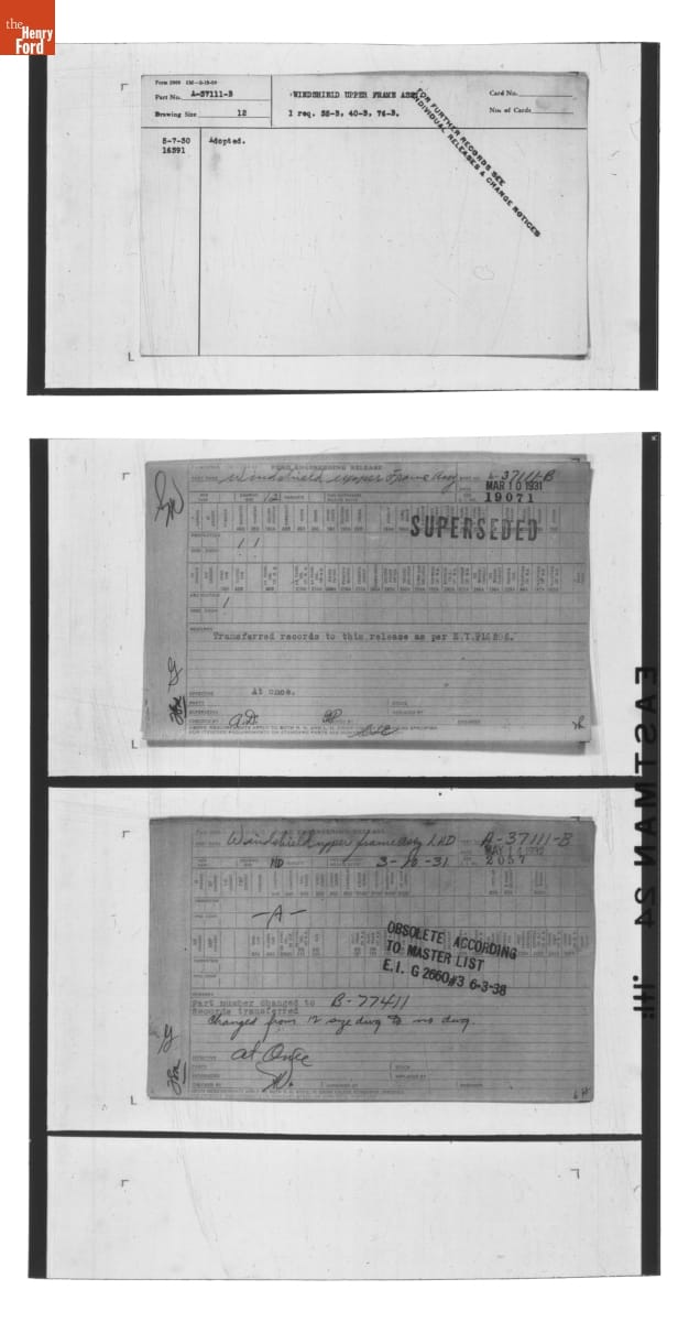 The Ford Motor Company created over a million parts drawings from 1903 to 1957. Many of these drawings specify engineering requirements for the components of Ford-made vehicles--including automobiles, trucks, tractors, military vehicles, and Tri-motor airplanes. Others provided information about assembly components, stages of casting and forging, or experimental designs. Beginning in the 1940s, Ford transferred the drawings and associated documents to microfilm.