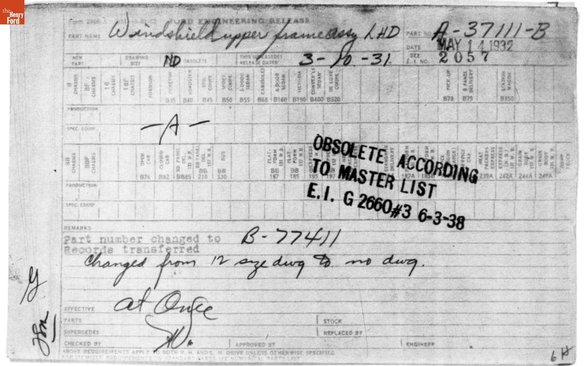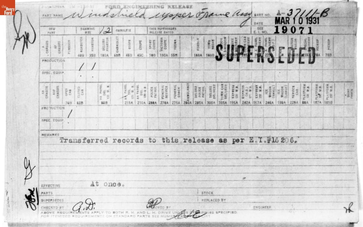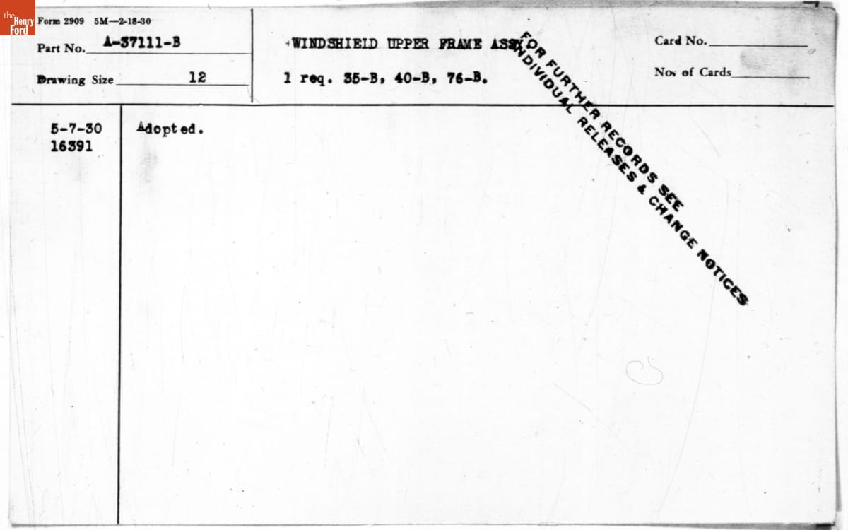 Engineering Release Notes, Windshield Upper Frame Assembly, Ford Model A, 1930-1938