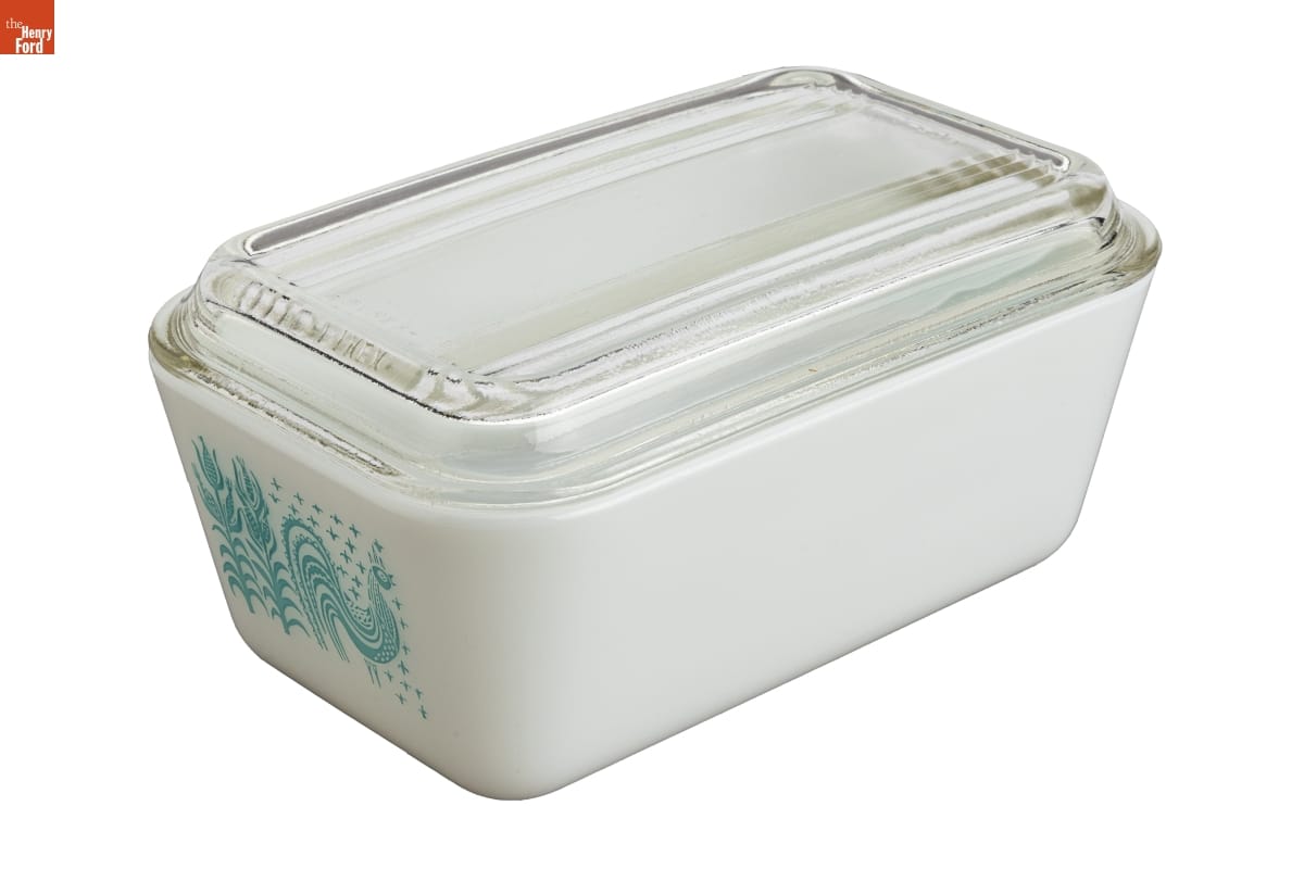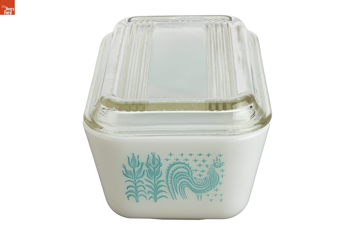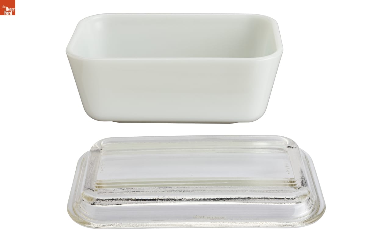 Corning Glass Works' heat-resistant glass bakeware, Pyrex, was introduced in the mid-1910s. Pyrex products were inexpensive, with an easy-to-clean smooth surface. The glassware could travel from refrigerator to oven to table. Corning introduced colored Pyrex kitchenware in 1947, and later, produced dishes in an array of patterns, like this Butterprint refrigerator dish made from 1957-1968.