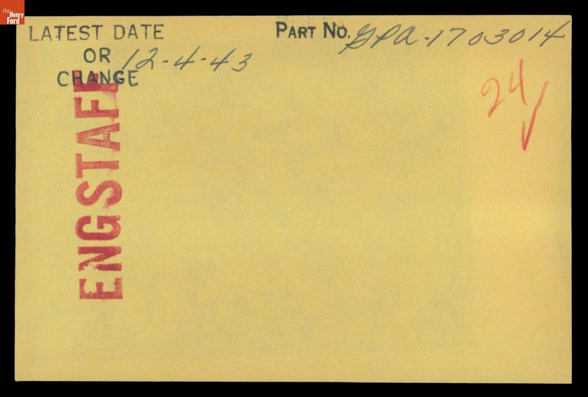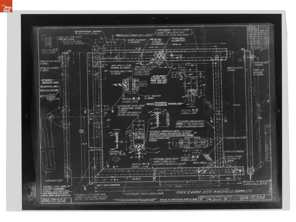 The Ford Motor Company created over a million parts drawings from 1903 to 1957. Many of these drawings specify engineering requirements for the components of Ford-made vehicles--including automobiles, trucks, tractors, military vehicles and Tri-motor airplanes. Others document assembly components, stages of casting and forging, or experimental designs. Beginning in the 1940s, Ford transferred the drawings to microfilm.