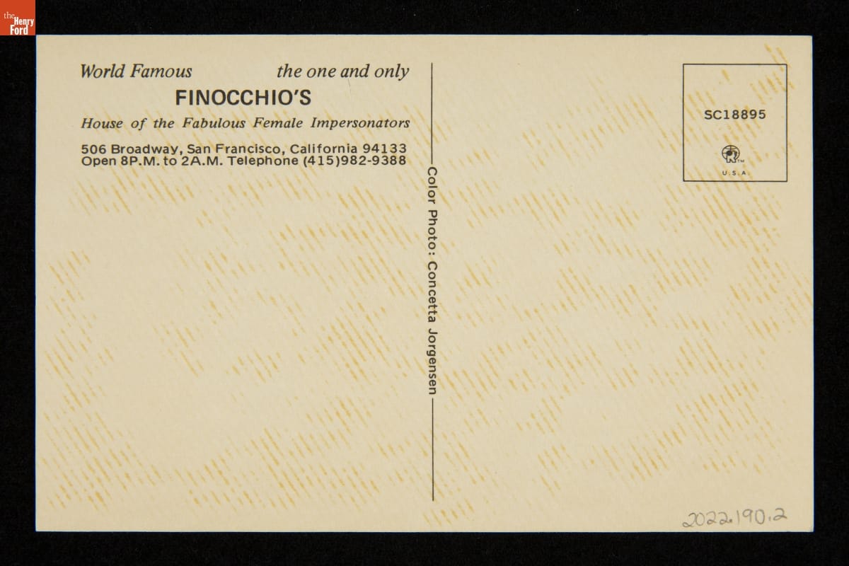 Established in 1929 as a place to see "female impersonator" revues, Finnochio's Club in San Francisco became well known for its drag performances. In addition to serving as a safe public space for the LGBTQ+ community, it was a popular tourist attraction into the early-1990s, before closing at the end of 1999.