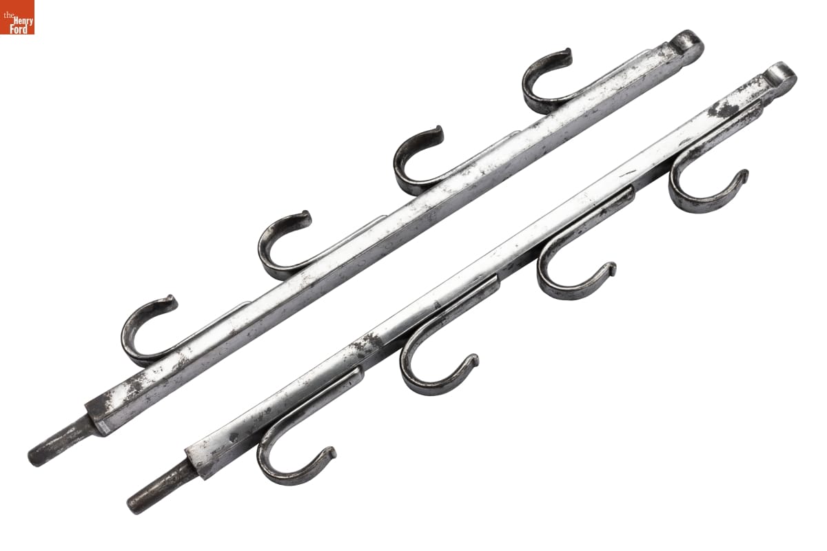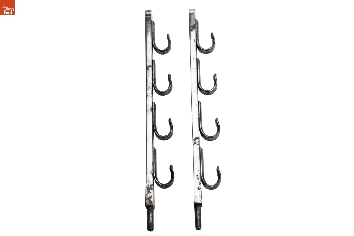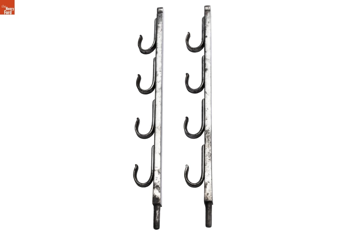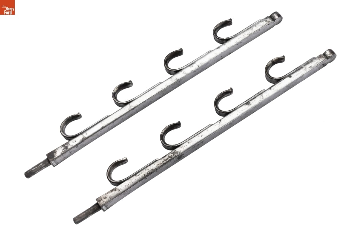 These two metal rods with applied hooks likely worked as a team. Each has a round dowel at one end that could fit into a receptacle, and a rounded finial at the other end for decoration. Each bracket, if positioned a set distance apart, could then be used to store or display thin items like fly-fishing rods.