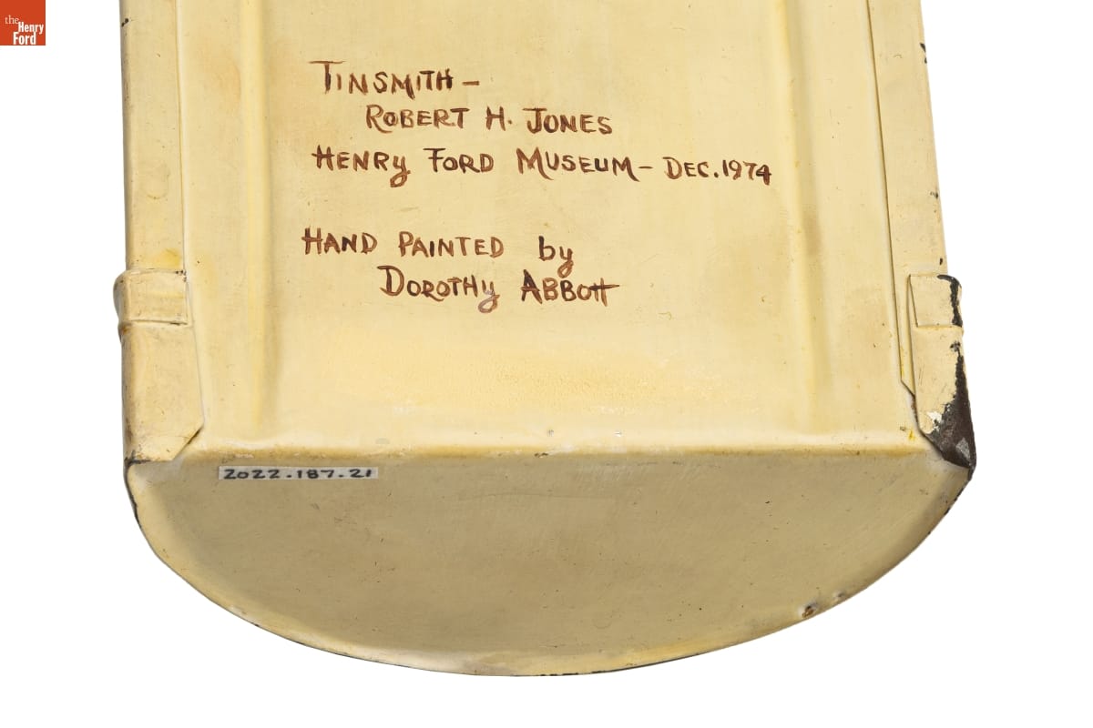 TINSMITH - / ROBERT H. JONES / HENRY FORD MUSEUM - DEC. 1974 / HAND PAINTED BY / DOROTHY ABBOTT