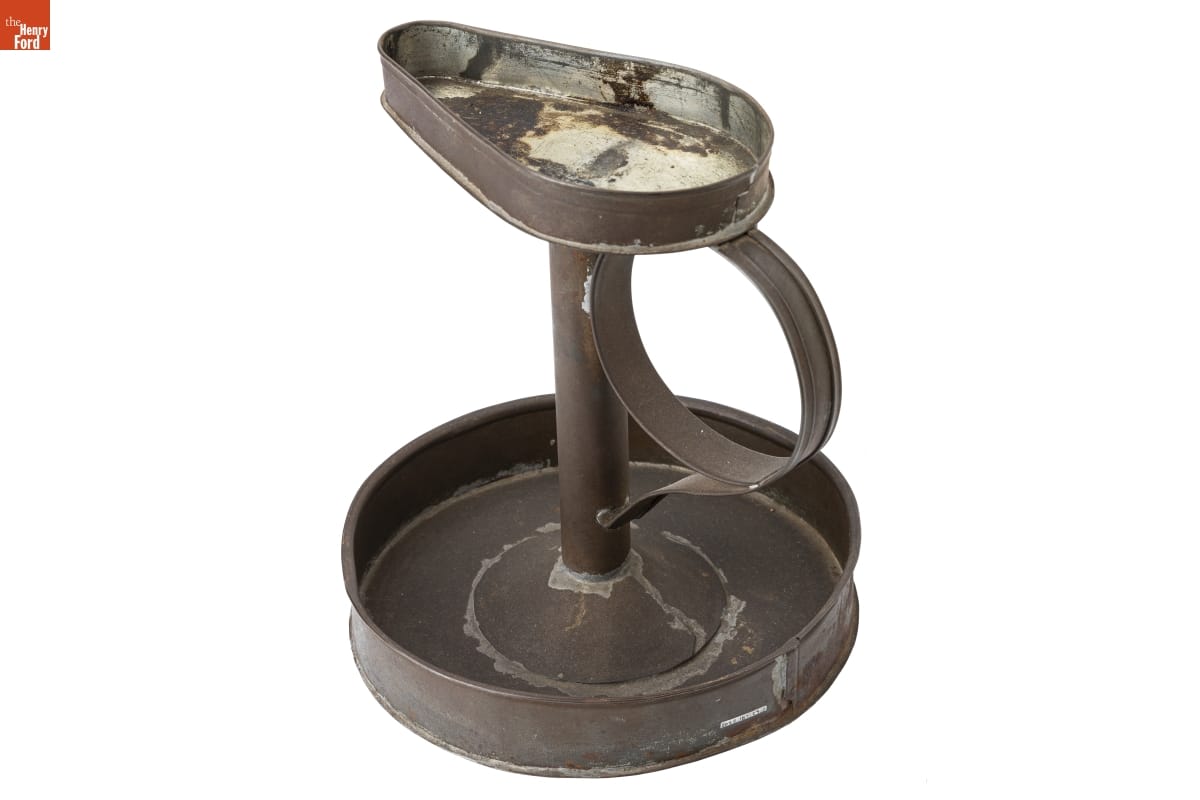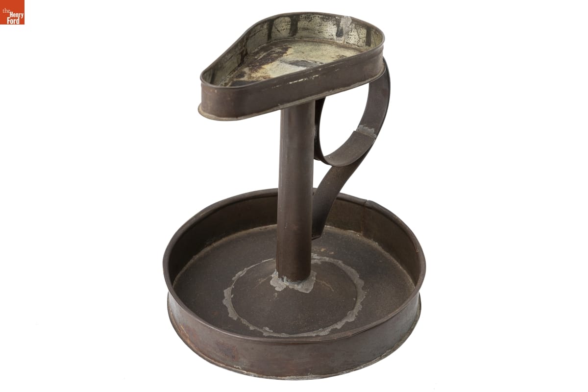 Tin-plated iron, commonly called "tin," was the dominant material for utilitarian items in 19th-century America. Local tinsmiths produced an almost endless range of goods. But as more durable and lower maintenance materials emerged, handmade tinware came to be considered a folk art or heritage craft. This 20th-century example was produced in the Greenfield Village tin shop using historical tinsmithing tools and techniques.