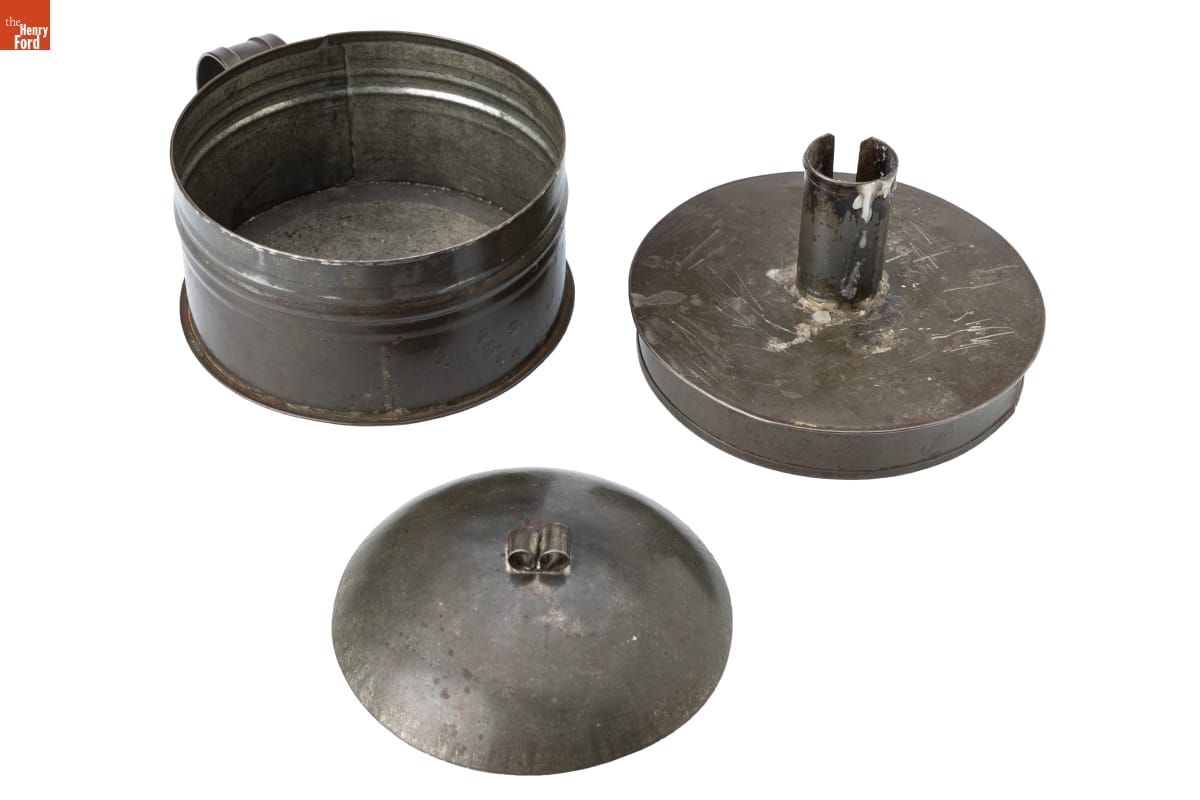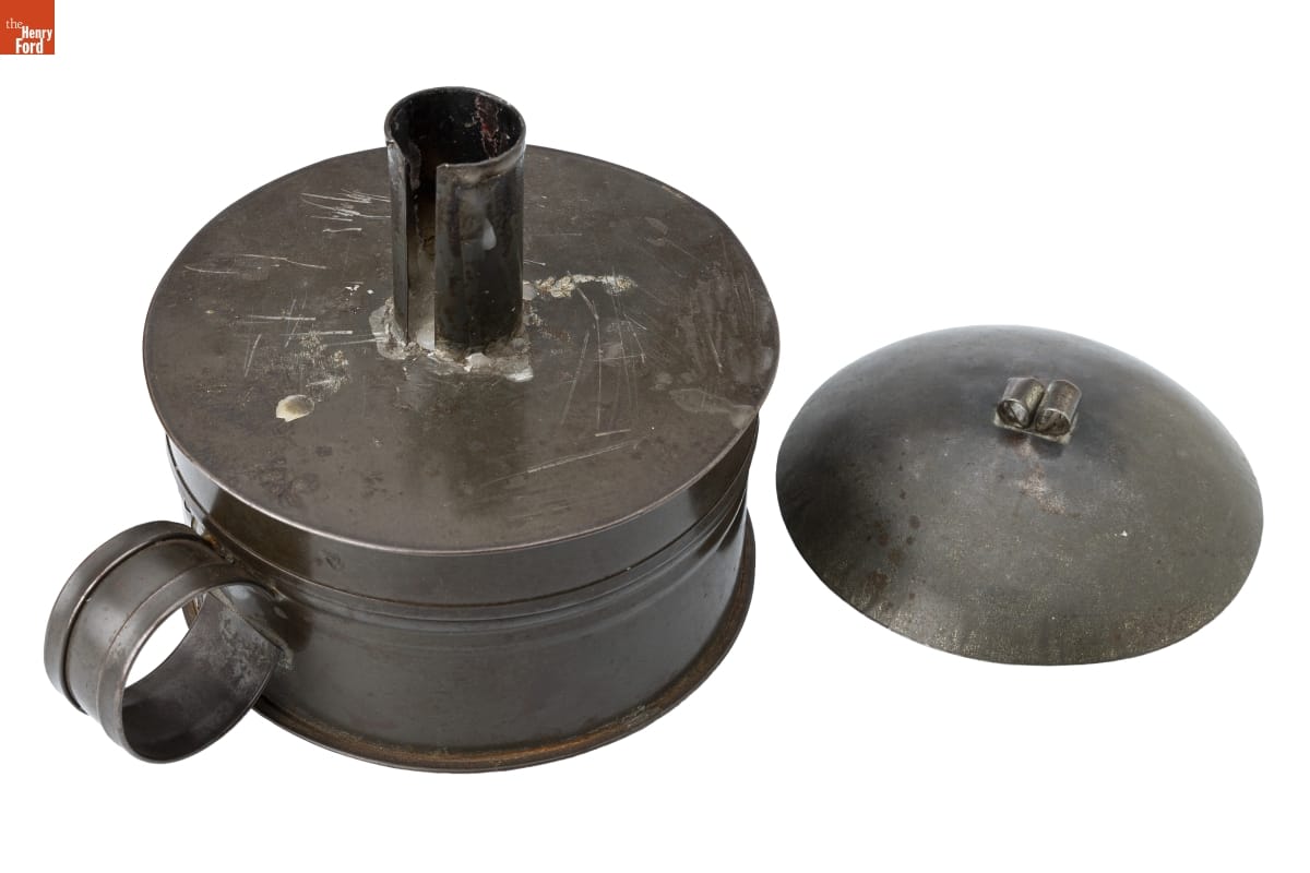 Tin-plated iron, commonly called "tin," was the dominant material for utilitarian items in 19th-century America. Local tinsmiths produced an almost endless range of goods. But as more durable and lower maintenance materials emerged, handmade tinware came to be considered a folk art or heritage craft. This 20th-century example was produced in the Greenfield Village tin shop using historical tinsmithing tools and techniques.