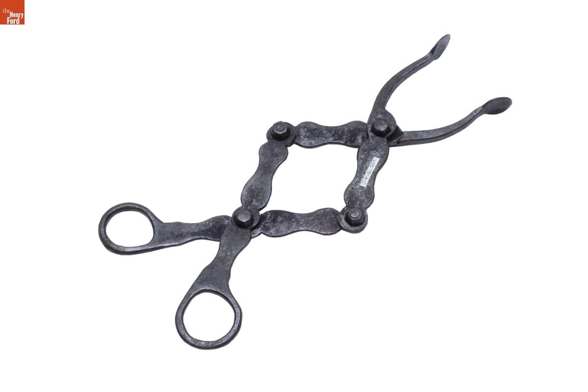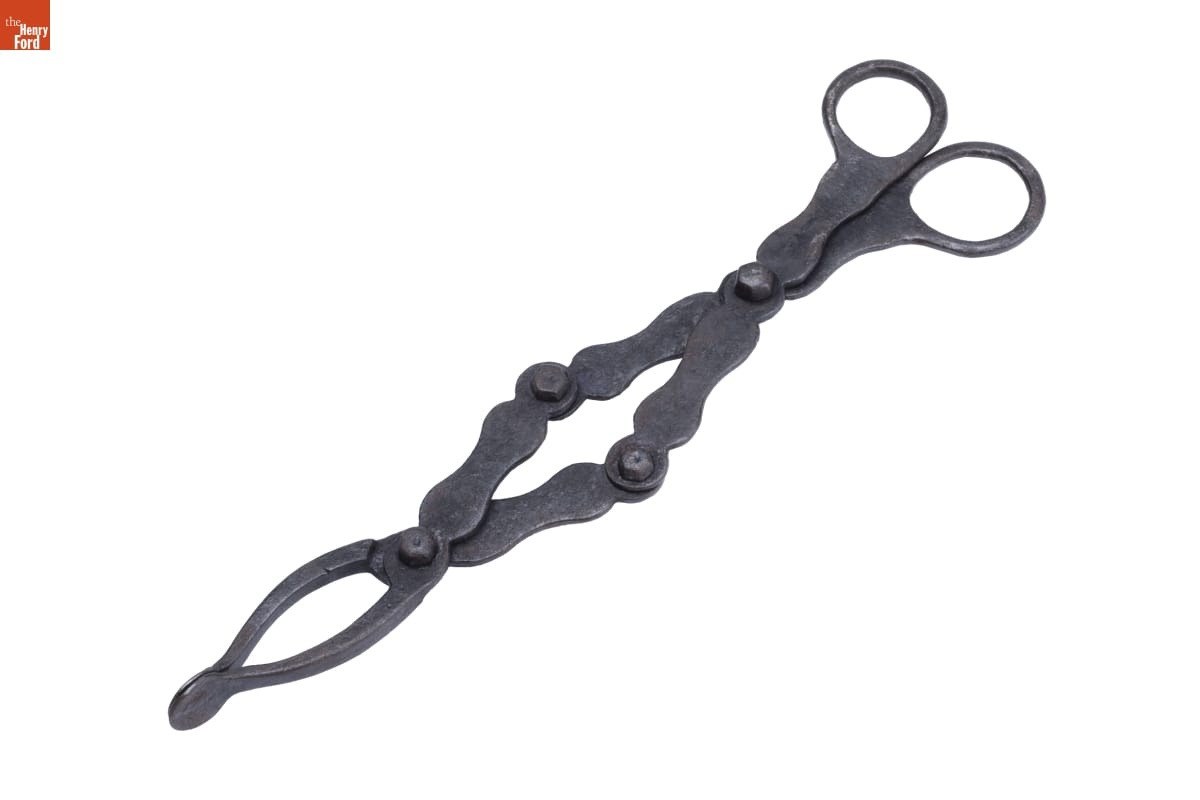 Before matches were widely available, smokers used tongs like this one to light their pipes. Closing the handles extended the flattened ends of the tongs toward the fire and helped them pick up an ember and hold it steady. Blacksmiths made the tongs from durable wrought iron that withstood the heat of the fire.