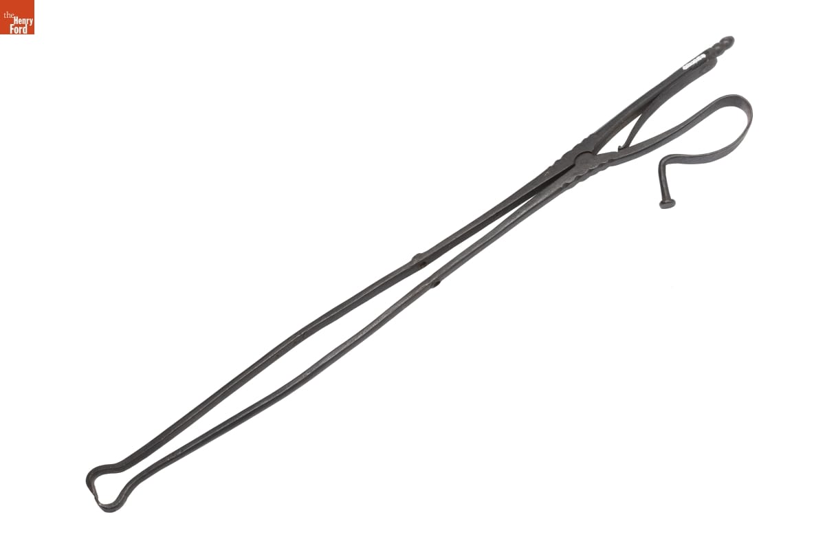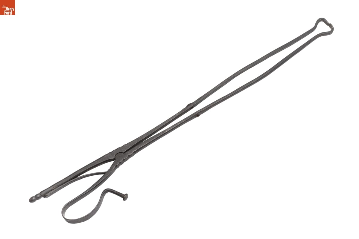 Before matches, smokers used tongs like this one to maintain and light their pipes. They tamped tobacco into their pipe bowl with one end, then turned it around and used the handles to pick up an ember while keeping a safe distance from the fire. Blacksmiths made the graceful but utilitarian tool from durable wrought iron that withstood heat.