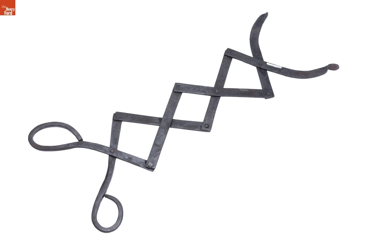 Before matches were widely available, smokers used tongs like this one to light their pipes. Closing the handles extended the flattened ends of the tongs toward the fire and helped them pick up an ember and hold it steady. Blacksmiths made the tongs from durable wrought iron that withstood the heat of the fire.