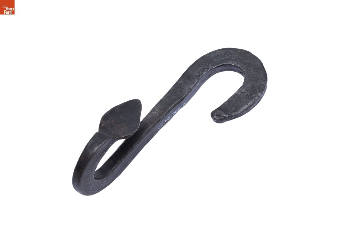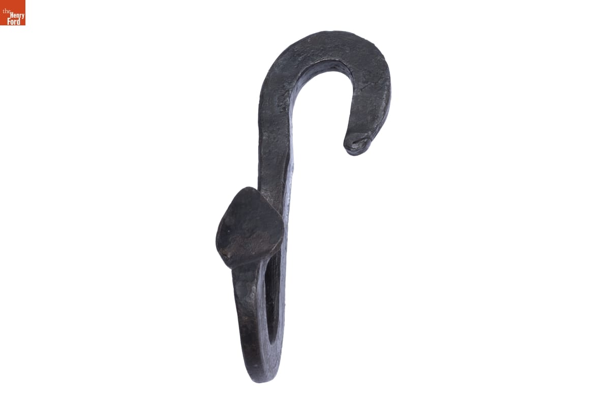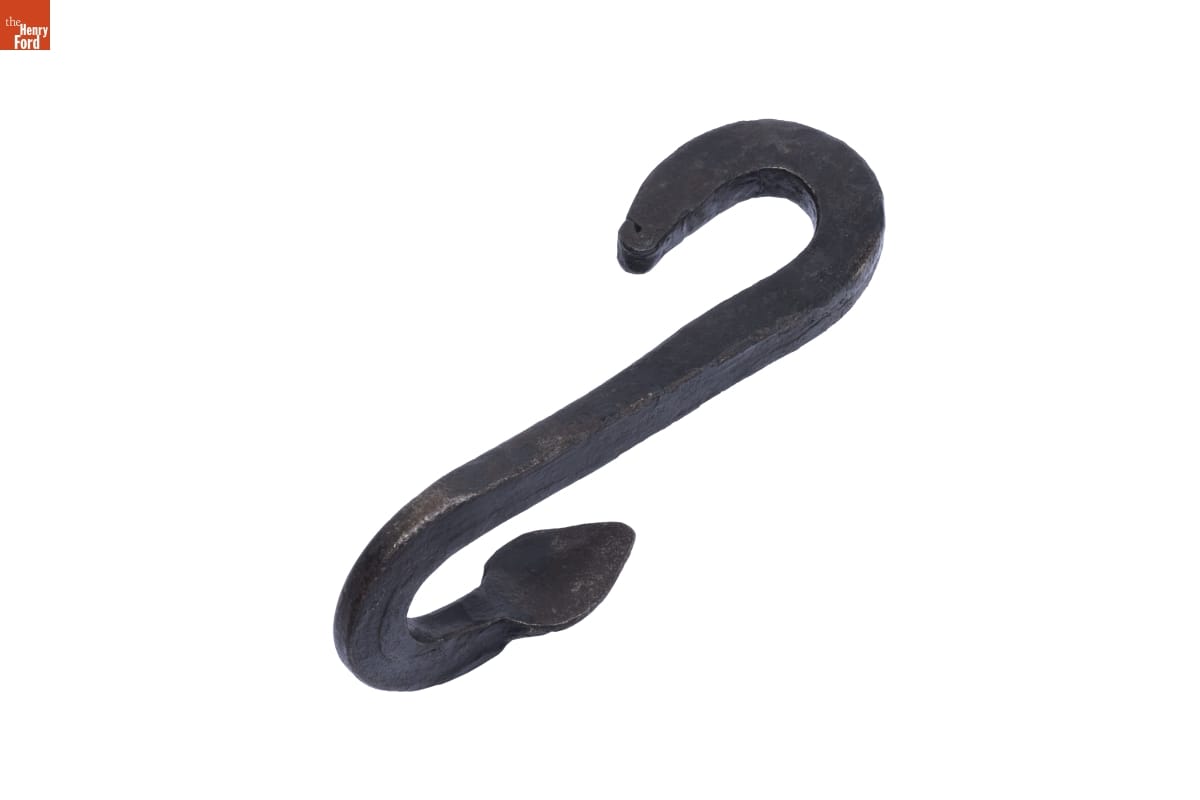 Pothooks like this one made cooking over a fire safe and more practical for homemakers in the 19th century. One end hooks onto the handle of the cooking pot, while the other suspends from a movable crane, positioning the pot safely over the fire.