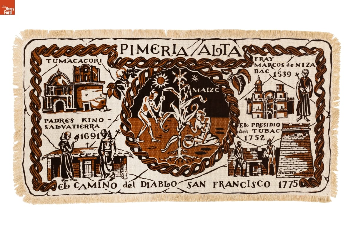 The screen-printed fabrics produced by the studio of Harwood Steiger, Inc. are replete with motifs from the American Southwest, including images depicting early Spanish colonization. Although husband-and-wife proprietors Harwood and Sophie Steiger were born in the Northeast, the Sonoran Desert became their home. The area inspired their enduring partnership, which saw Harwood as the primary artist, and Sophie as the expert botanist and businesswoman.