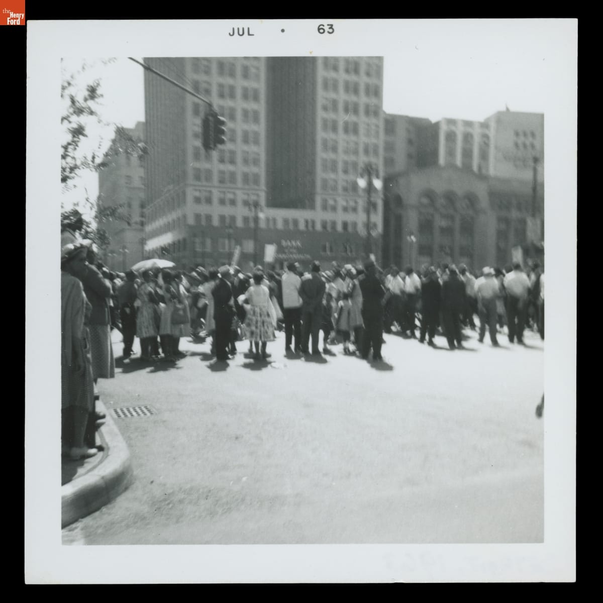 Detroit's 1963 Walk to Freedom--a protest that grew to a national event attracting some 125,000 people--helped move the ongoing civil rights struggle to a new focus on the urban North. Dr. Martin Luther King, Jr., presented a prelude to his famous "I Have a Dream" speech here. This candid snapshot, taken by an attendee at the protest, captures the excitement of the moment.