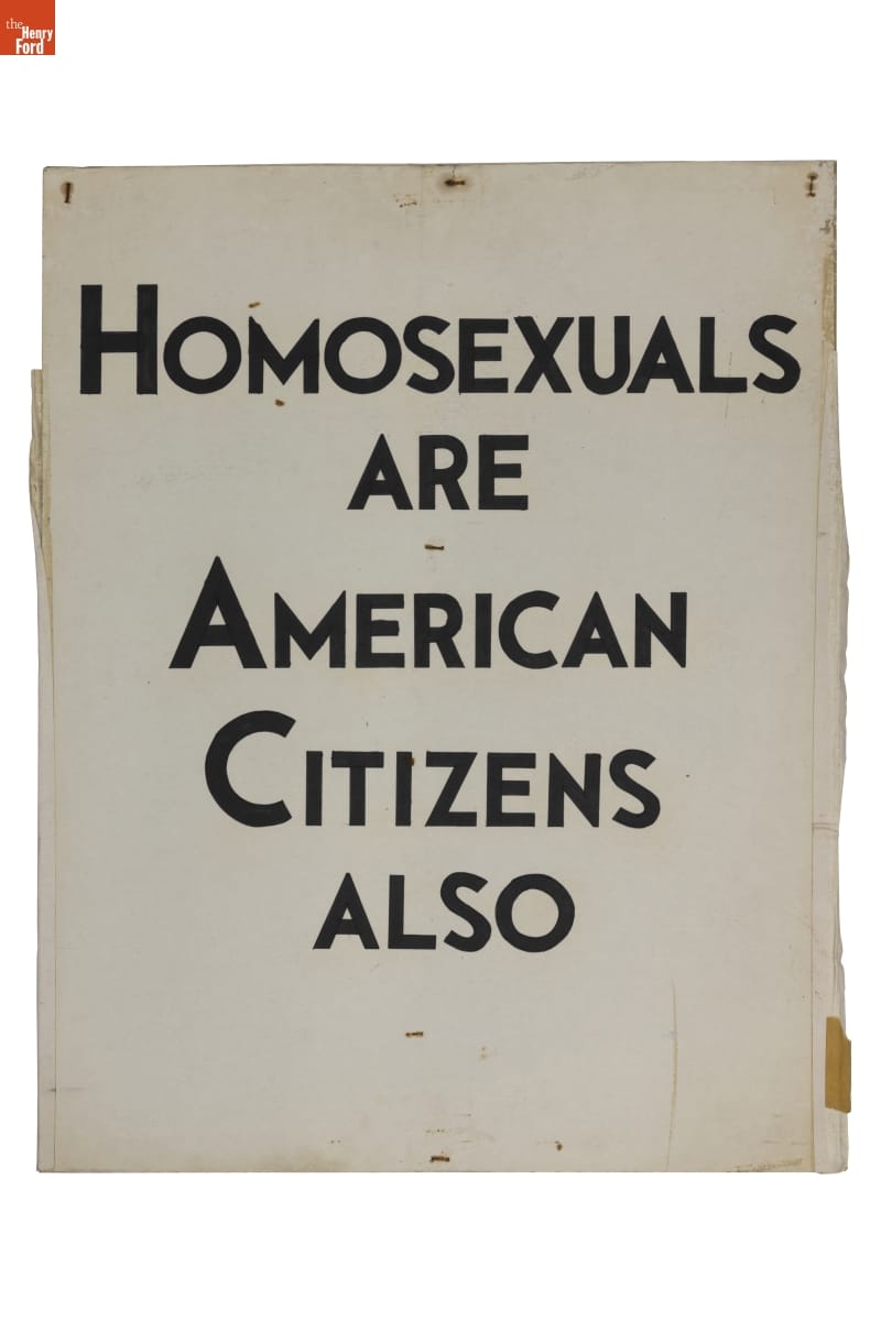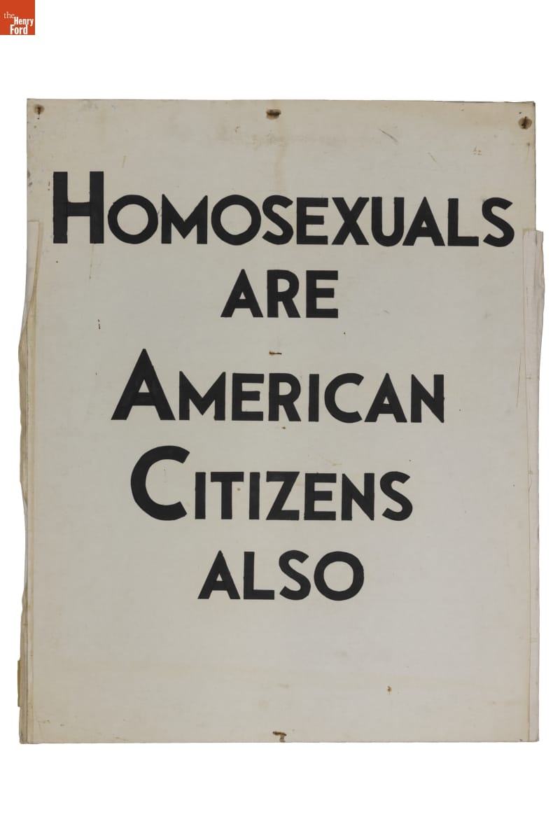 This handmade picket sign was carried by physicist and gay civil rights activist Frank Kameny at Philadelphia's Annual Reminder March on July 4, 1969. This event occurred one week after the Stonewall Uprising in NYC. The Annual Reminder marches were quiet and calculated, emphasizing the powerful messaging on picketers' signs rather than unruly and rebellious forms of protest.