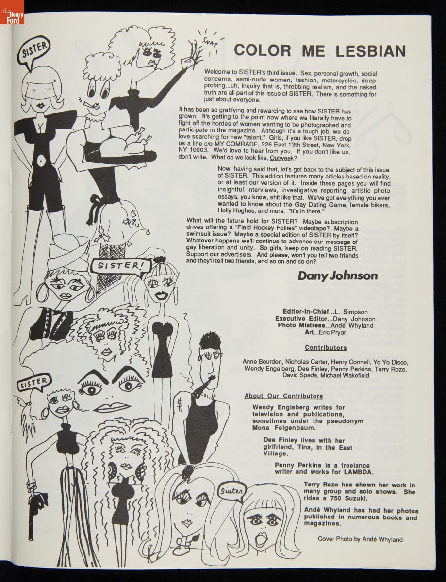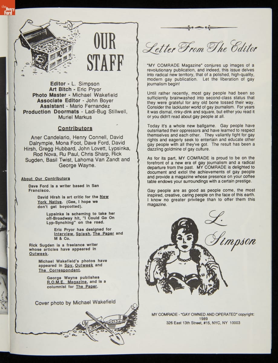 My Comrade was an underground "zine" launched in 1987 by drag queen Linda Simpson. The magazine was an irreverent platform for LGBTQ+ culture and politics in NYC's East Village, advertising itself as "the court jester of the queer press." My Comrade focused on drag queens, and the flip side of each issue also contained Sister!--a zine celebrating lesbian community.