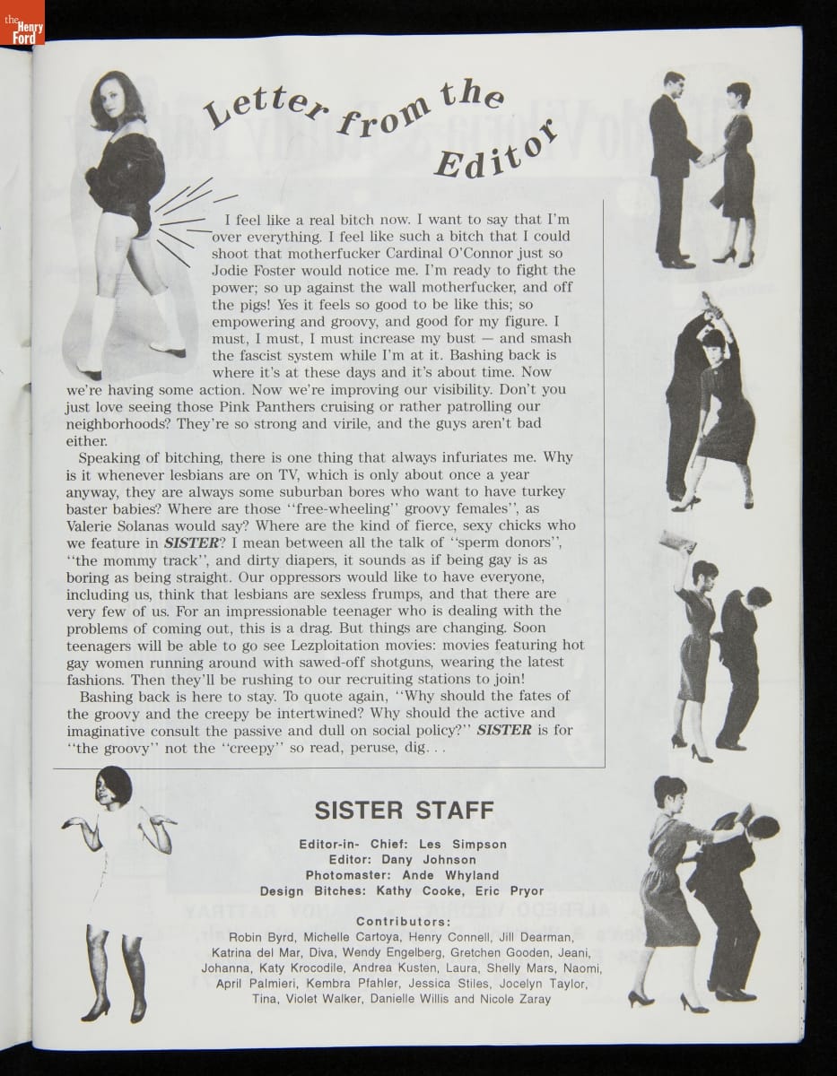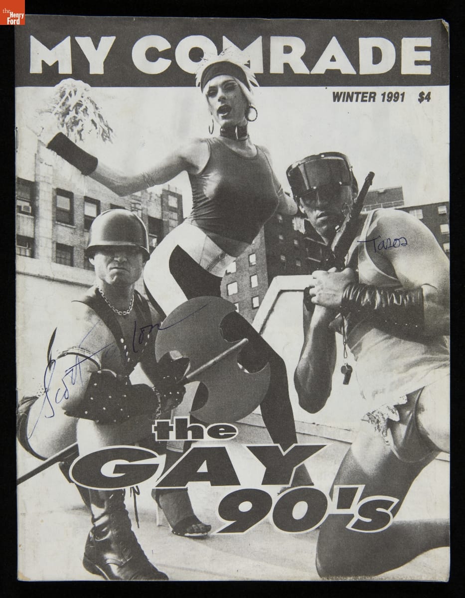 My Comrade was an underground "zine" launched in 1987 by drag queen Linda Simpson. The magazine was an irreverent platform for LGBTQ+ culture and politics in NYC's East Village, advertising itself as "the court jester of the queer press." My Comrade focused on drag queens, and the flip side of each issue also contained Sister!--a zine celebrating lesbian community.