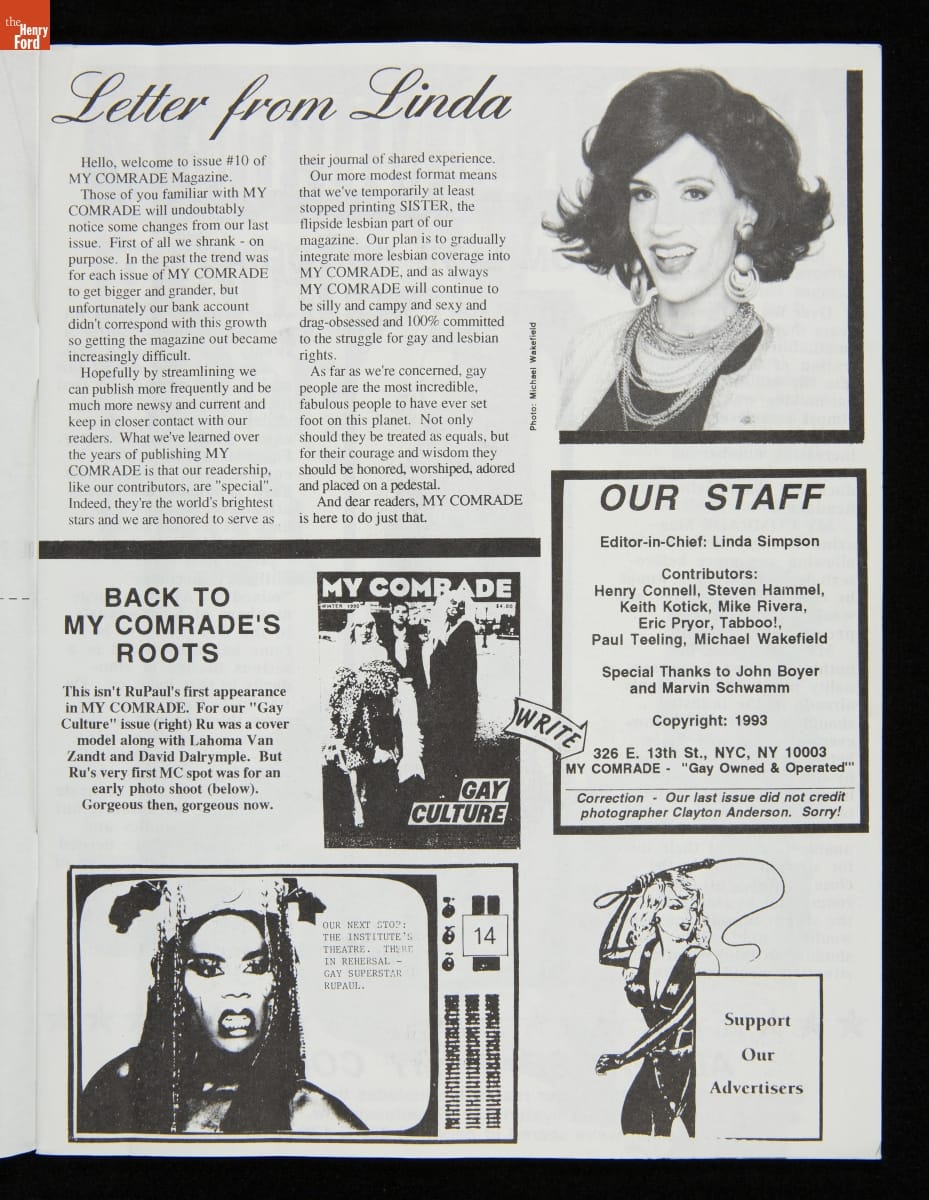My Comrade was an underground "zine" launched in 1987 by drag queen Linda Simpson. The magazine was an irreverent platform for LGBTQ+ culture and politics in NYC's East Village, advertising itself as "the court jester of the queer press." My Comrade focused on drag queens, and the flip side of each issue also contained Sister!--a zine celebrating lesbian community.