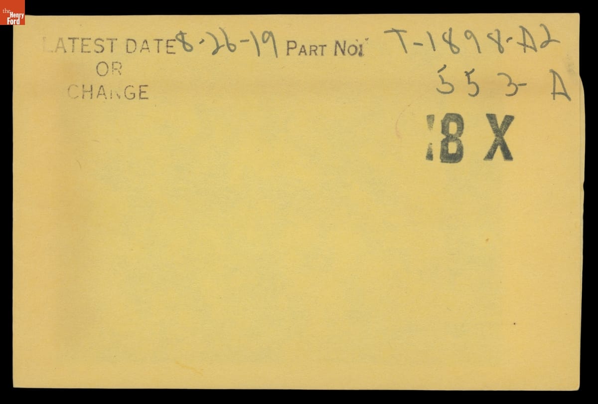 The Ford Motor Company created over a million parts drawings from 1903 to 1957. Many of these drawings specify engineering requirements for the components of Ford-made vehicles--including automobiles, trucks, tractors, military vehicles and Tri-motor airplanes. Others document assembly components, stages of casting and forging, or experimental designs. Beginning in the 1940s, Ford transferred the drawings to microfilm.