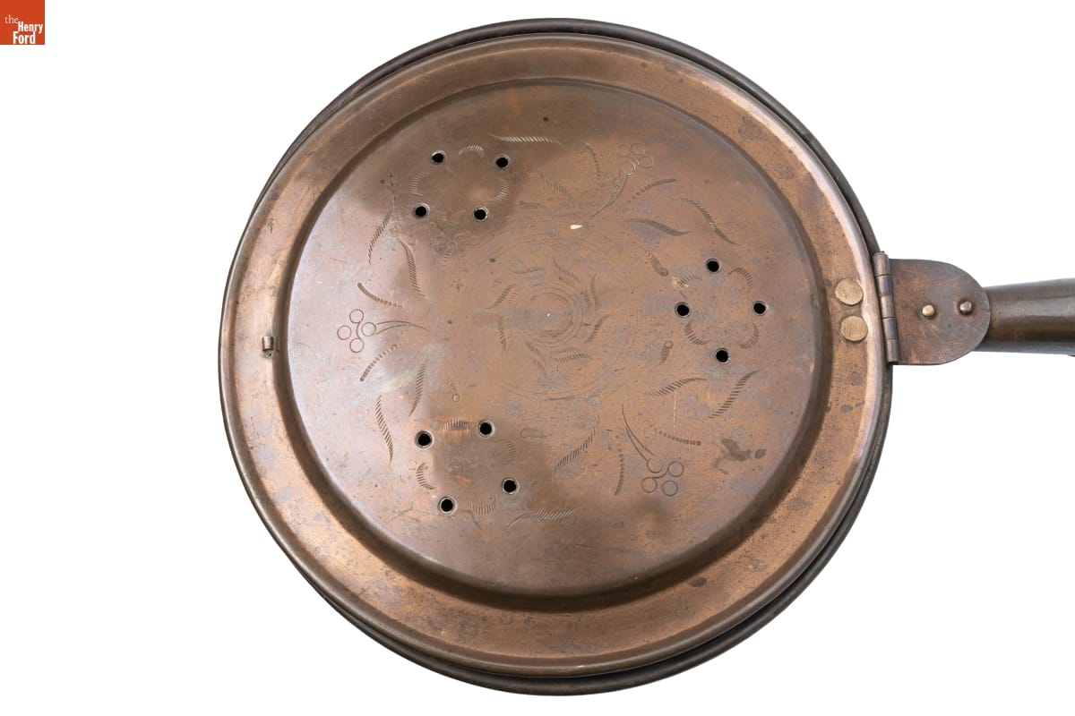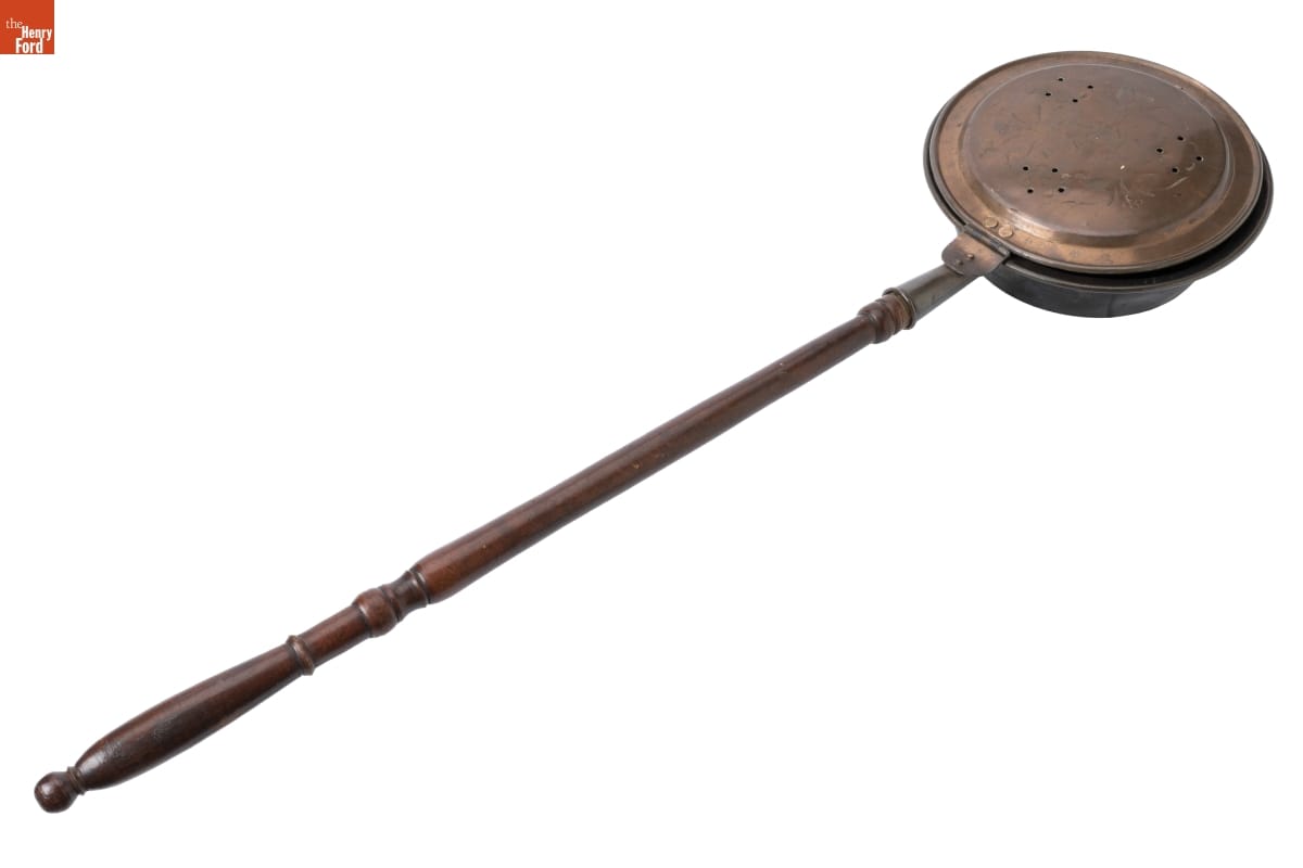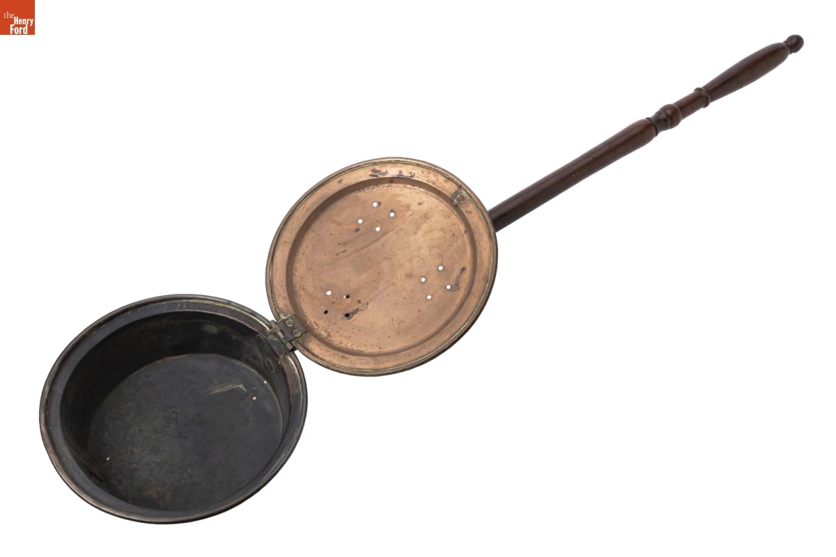 In the 18th and 19th centuries, people used bed warmers like this one during cold weather to heat bedding before going to sleep. A person would fill the pan with hot coals, then pass it between the sheet and covers. Long handles enabled the user to reach into far corners. Many bed warmers had lids embellished with incised decorations.