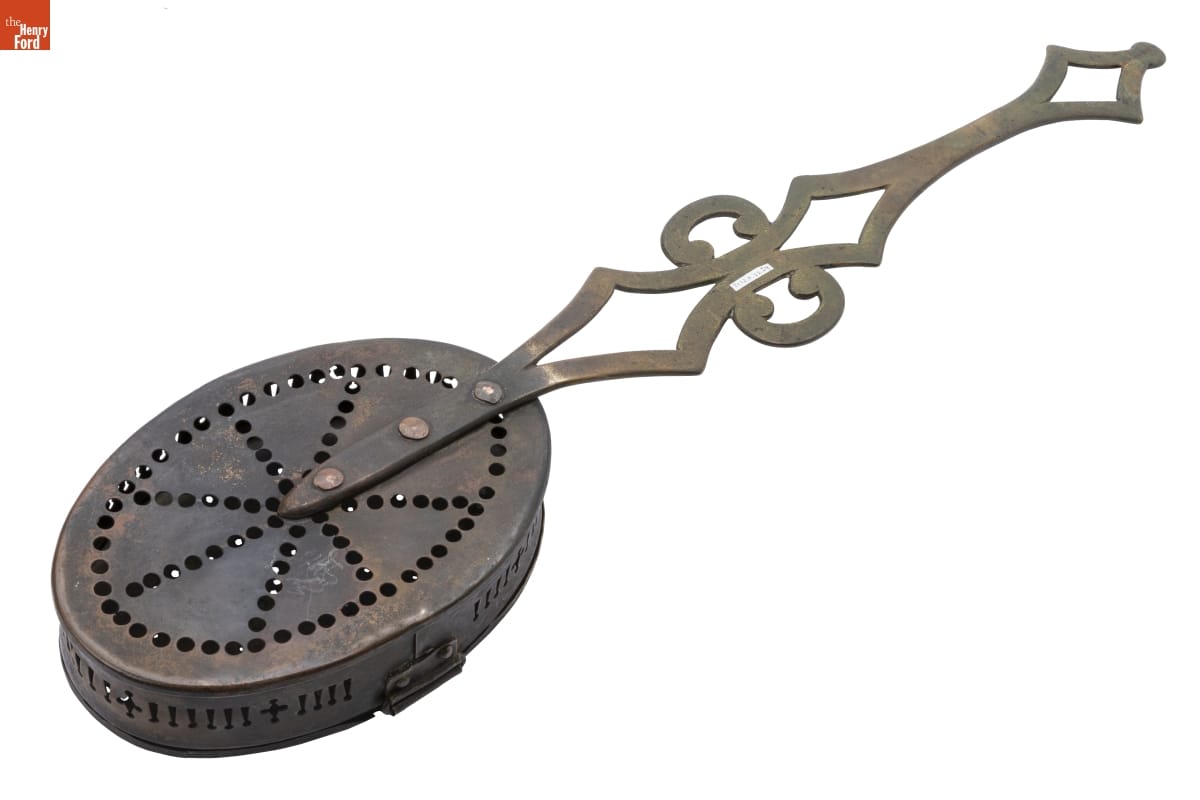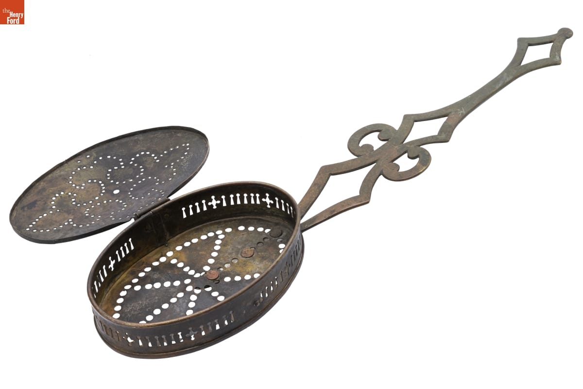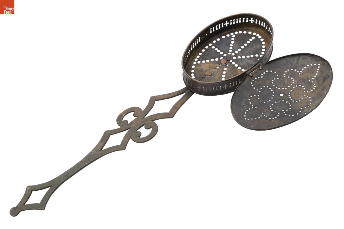 Chestnut trees produce an edible fruit that has been a popular treat for thousands of years among people throughout the world. Since chestnuts are harvested in the fall and are perishable, they tend to be associated with late-year and winter celebrations. Roasting chestnuts is a common way to prepare them. In the 19th century, people used roasters like this one.
