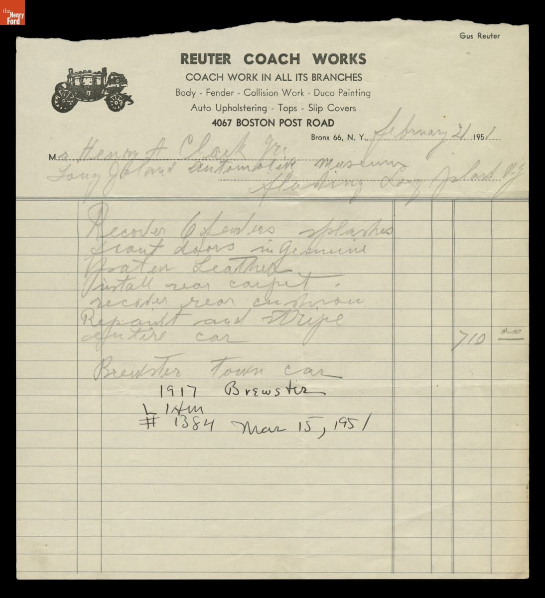 Invoice for Restoration Work on a 1917 Brewster Town Car, 1951