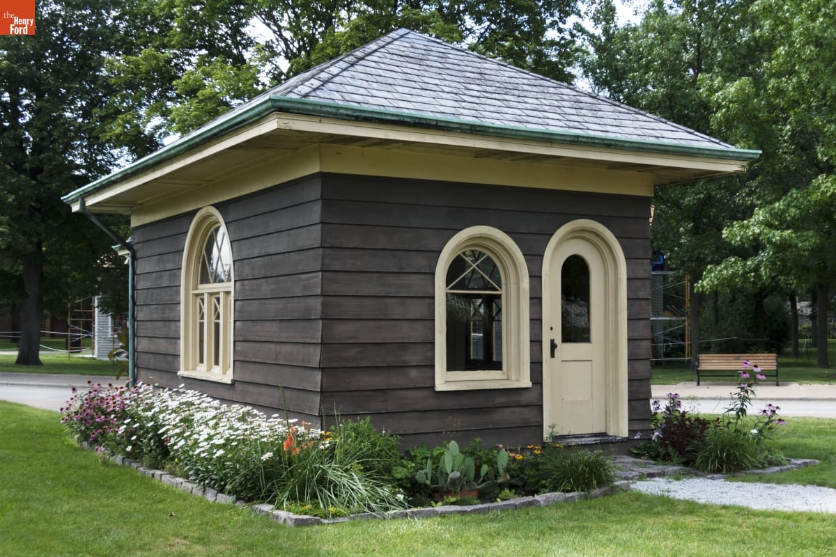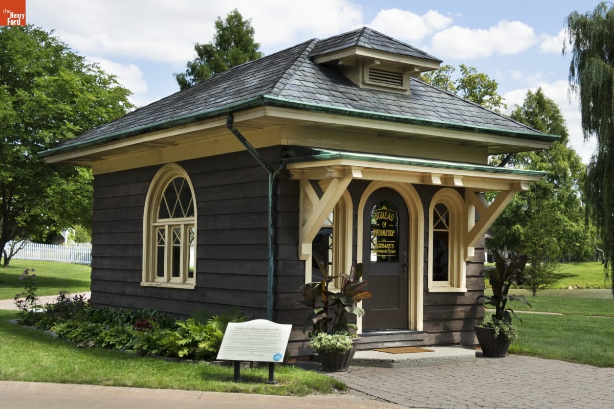 Luther Burbank (1849-1926), an American horticulturalist and author, gained a reputation for selective breeding that yielded more than 800 new fruits, vegetables, flowers, and other plants. He opened this Bureau of Information in 1910 at the corner of his 40-acre experimental garden in Santa Rosa to sell seeds and souvenirs. It served various purposes over the years until Burbank's widow offered it to Henry Ford in 1928.