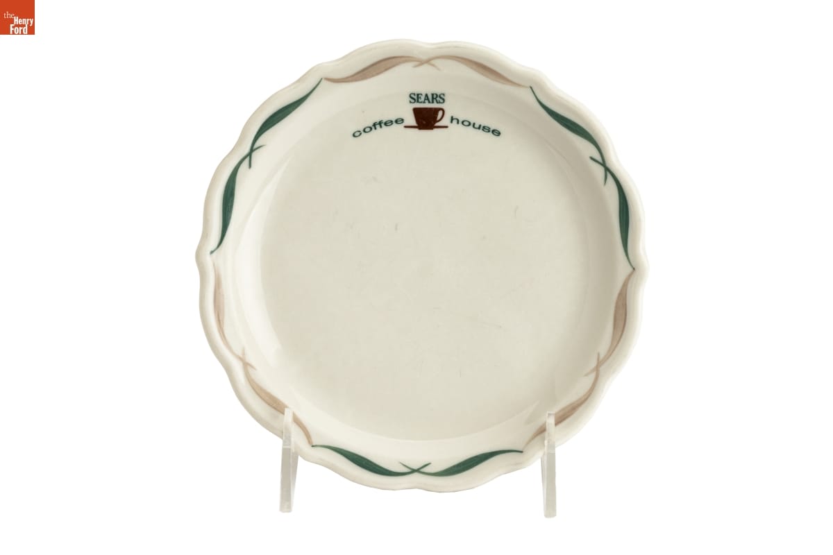 Many Sears department stores during the mid-20th century featured in-store cafeterias. Customers could stop in for a quick cup of coffee and a bite to eat or sit down for a meal after a long day of shopping. Employees served food on durable, vitreous china plates, like this one, emblazoned with the Sears Coffee House logo.
