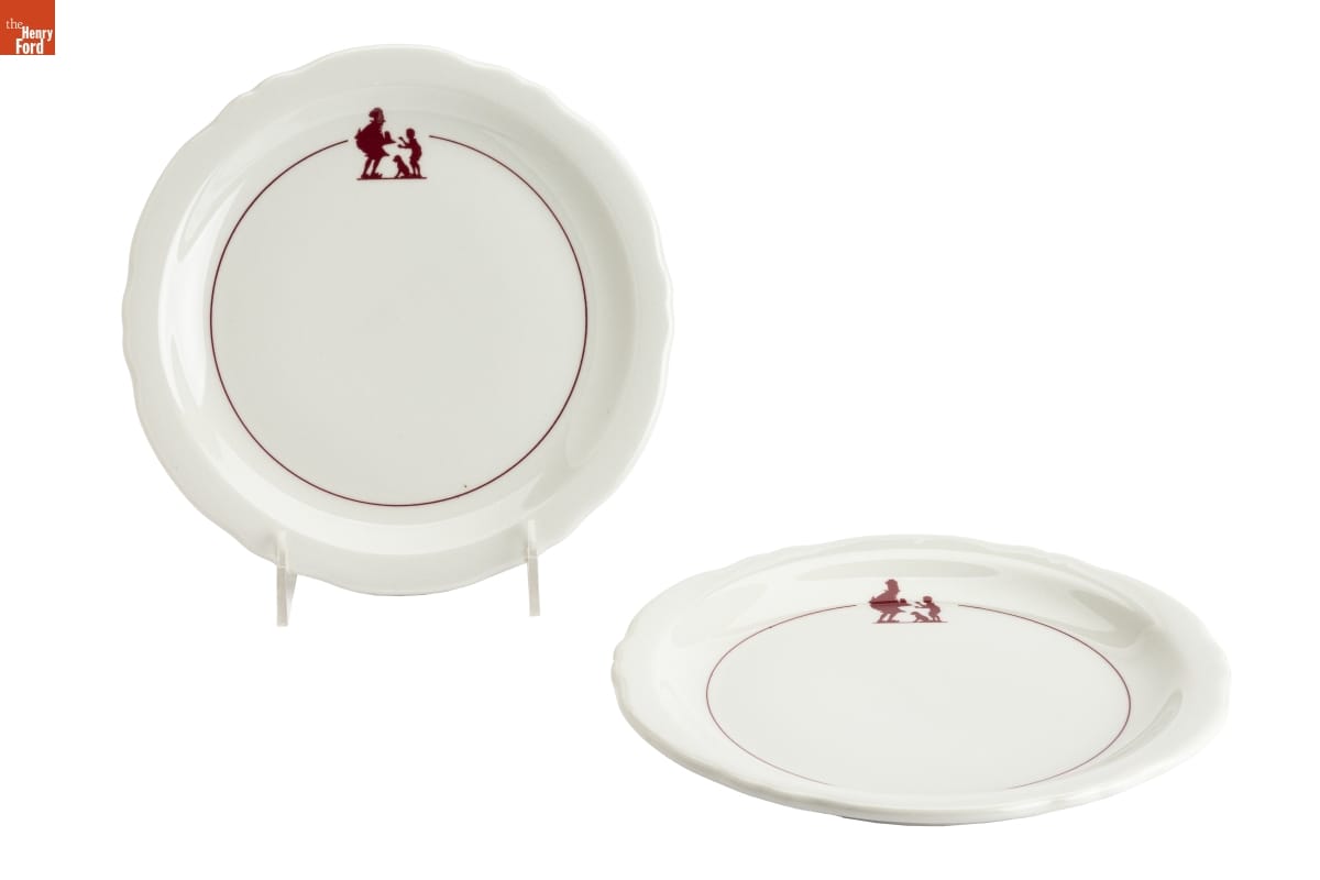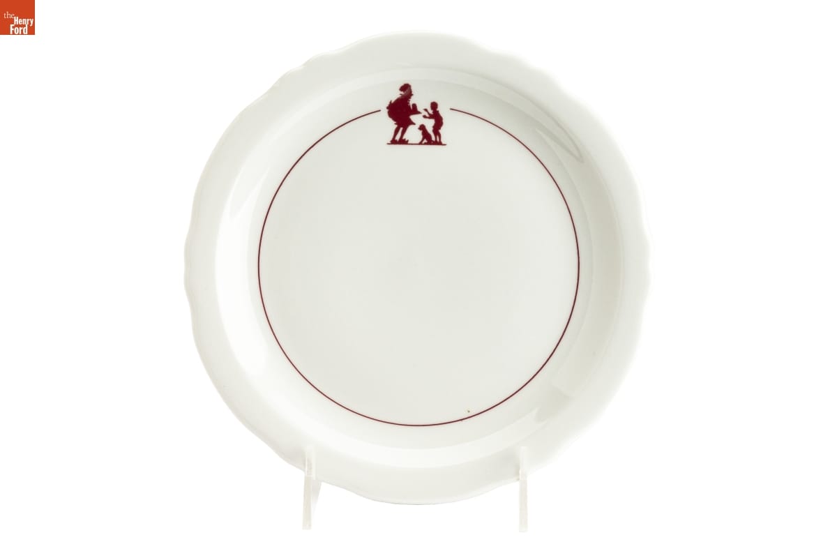 In the 1920s, Howard Deering Johnson began selling ice cream from food stands around Boston, Massachusetts. Johnson later expanded his business to full-service restaurants. He franchised these orange-roofed establishments across America -- locating them along highways to cater to the traveling public. The Simple Simon and the Pieman logo -- seen on this plate -- became a recognizable symbol to his motoring patrons.