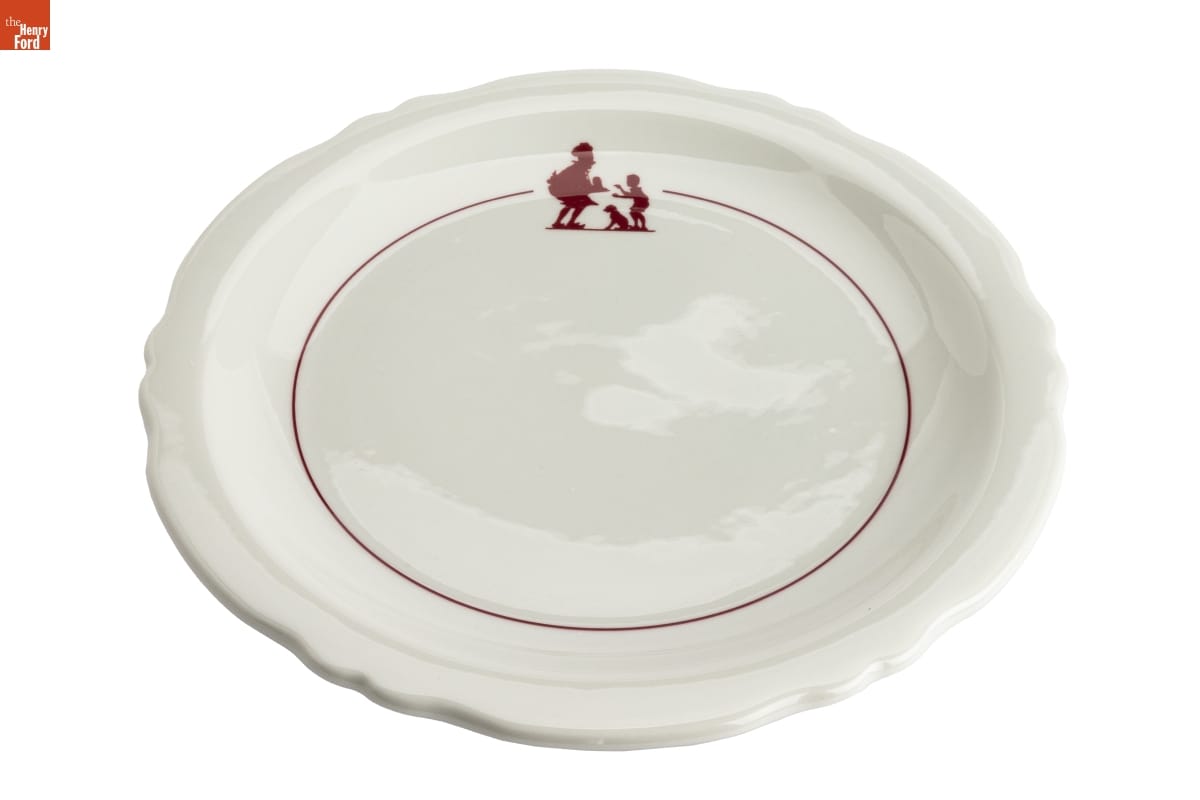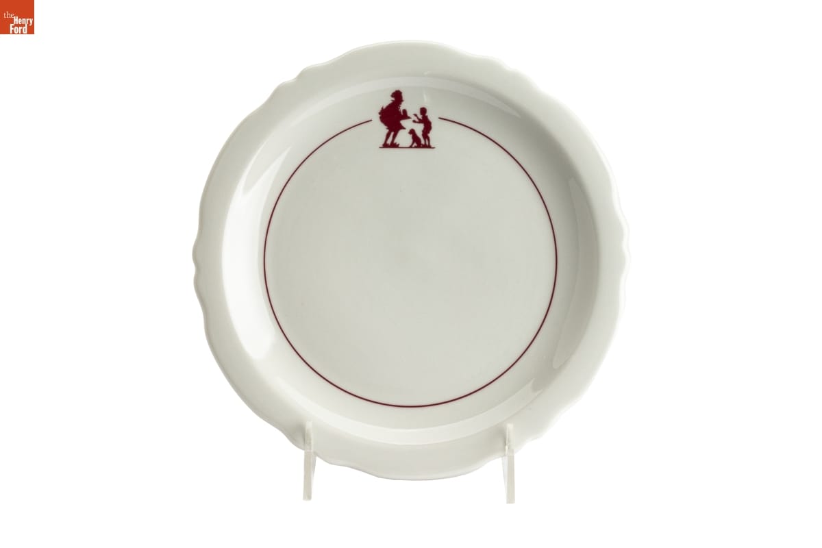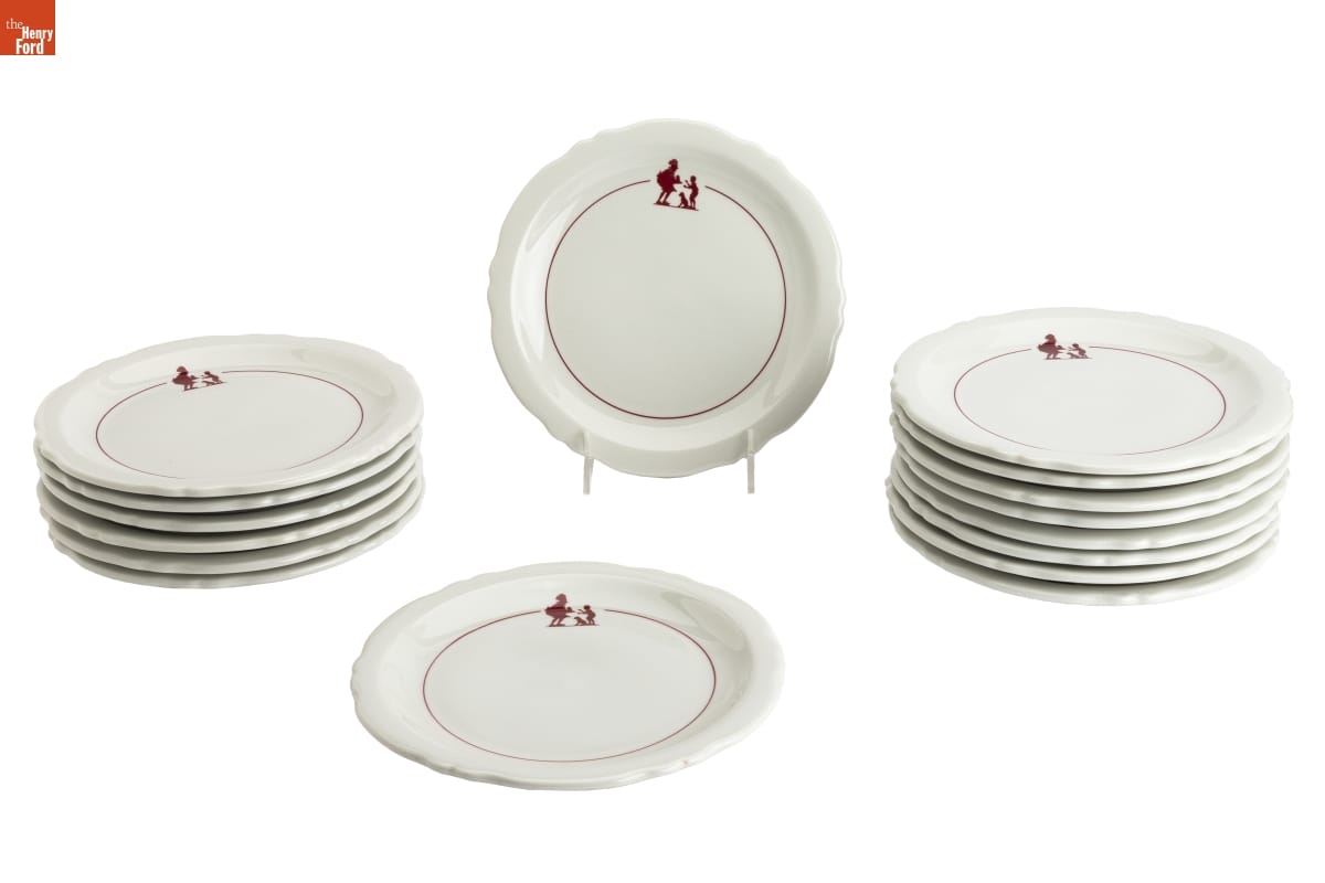 In the 1920s, Howard Deering Johnson began selling ice cream from food stands around Boston, Massachusetts. Johnson later expanded his business to full-service restaurants. He franchised these orange-roofed establishments across America -- locating them along highways to cater to the traveling public. The Simple Simon and the Pieman logo -- seen on these plates -- became a recognizable symbol to his motoring patrons.