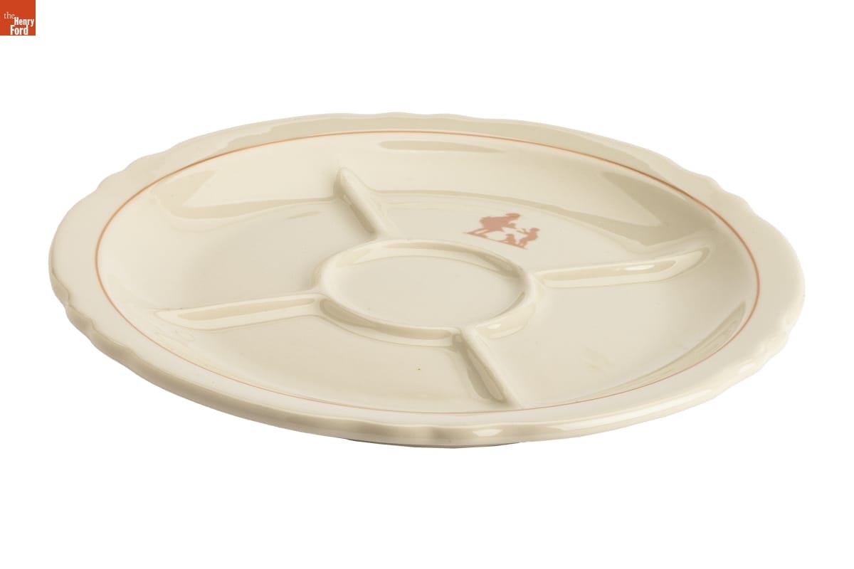 In the 1920s, Howard Deering Johnson began selling ice cream from food stands around Boston, Massachusetts. Johnson later expanded his business to full-service restaurants. He franchised these orange-roofed establishments across America -- locating them along highways to cater to the traveling public. The Simple Simon and the Pieman logo -- seen on this plate -- became a recognizable symbol to his motoring patrons.