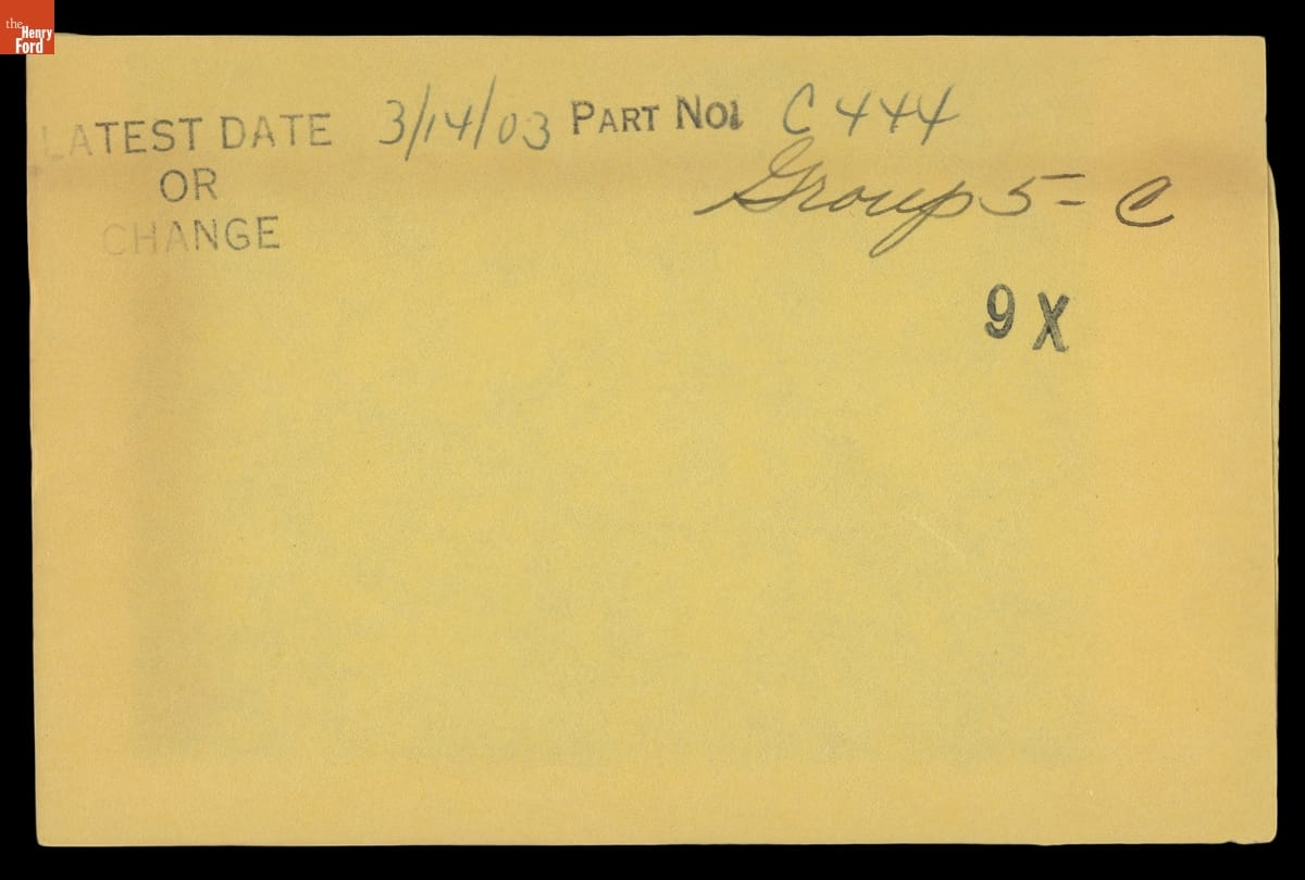 The Ford Motor Company created over a million parts drawings from 1903 to 1957. Many of these drawings specify engineering requirements for the components of Ford-made vehicles--including automobiles, trucks, tractors, military vehicles and Tri-motor airplanes. Others document assembly components, stages of casting and forging, or experimental designs. Beginning in the 1940s, Ford transferred the drawings to microfilm.