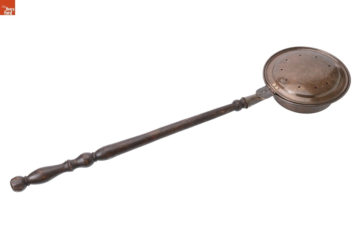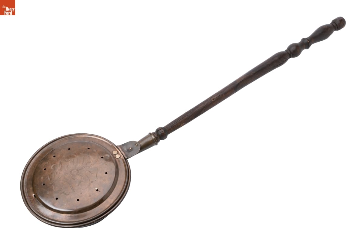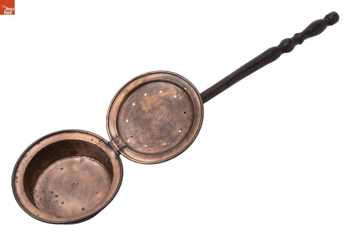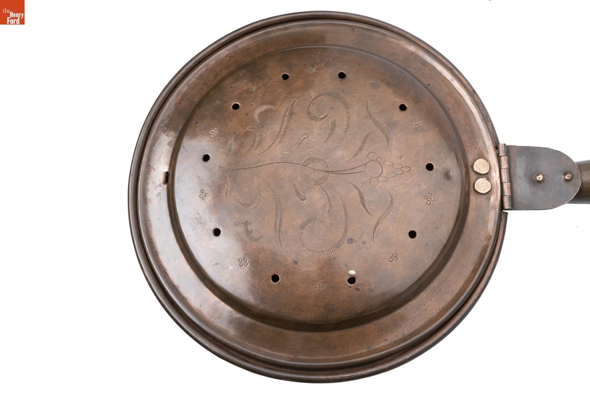 In the 18th and 19th centuries, people used bed warmers like this one during cold weather to heat bedding before going to sleep. A person would fill the pan with hot coals, then pass it between the sheet and covers. Long handles enabled the user to reach into far corners. Many bed warmers had lids embellished with incised decorations.