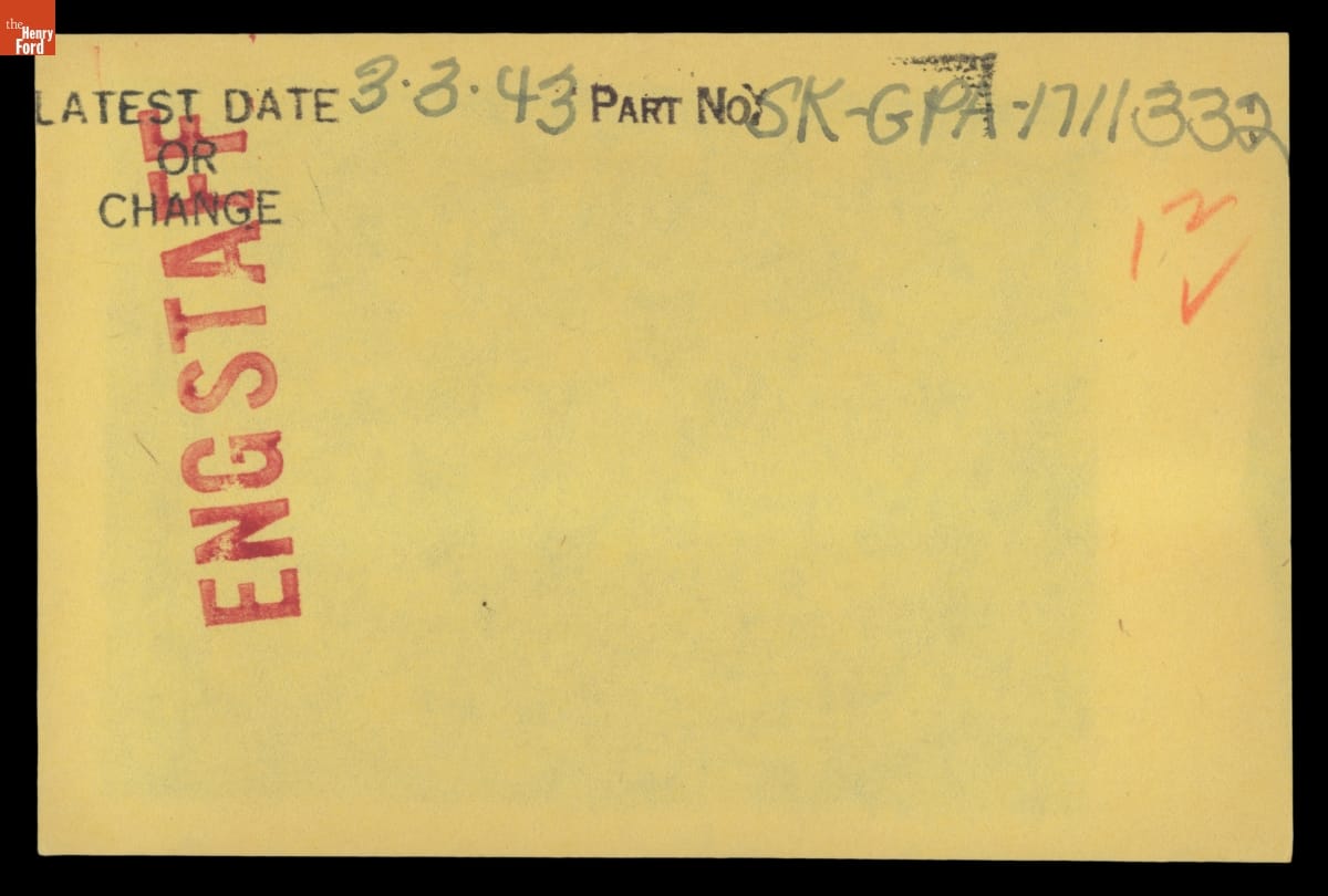 The Ford Motor Company created over a million parts drawings from 1903 to 1957. Many of these drawings specify engineering requirements for the components of Ford-made vehicles--including automobiles, trucks, tractors, military vehicles and Tri-motor airplanes. Others document assembly components, stages of casting and forging, or experimental designs. Beginning in the 1940s, Ford transferred the drawings to microfilm.