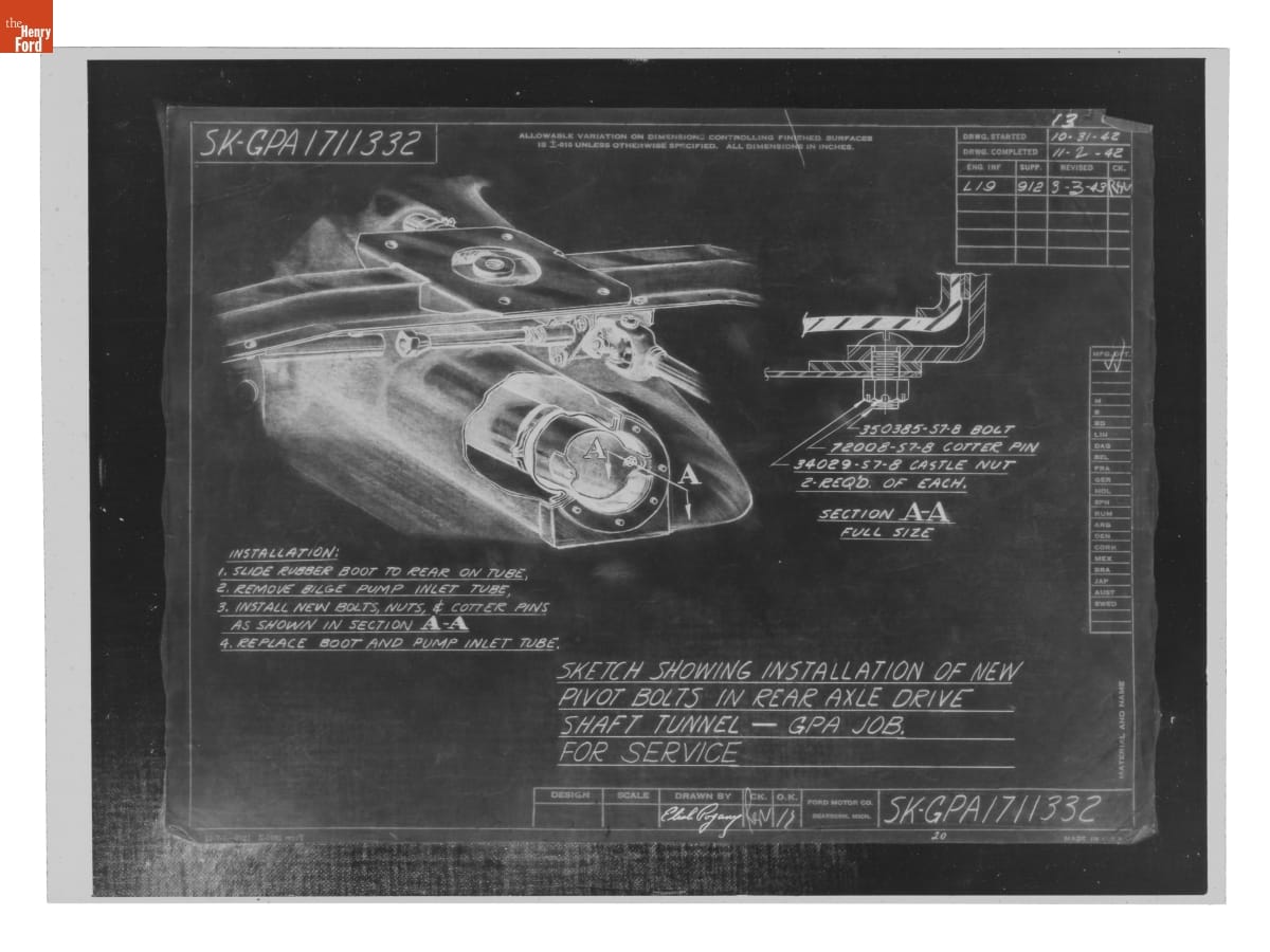 "Sketch Showing Installation of New Pivot Bolts in Rear Axle Drive Shaft Tunnel," Ford GPA, March 3, 1943