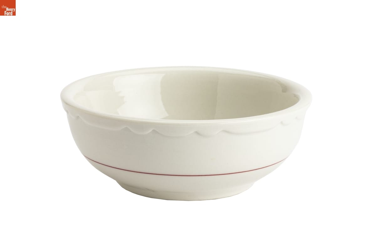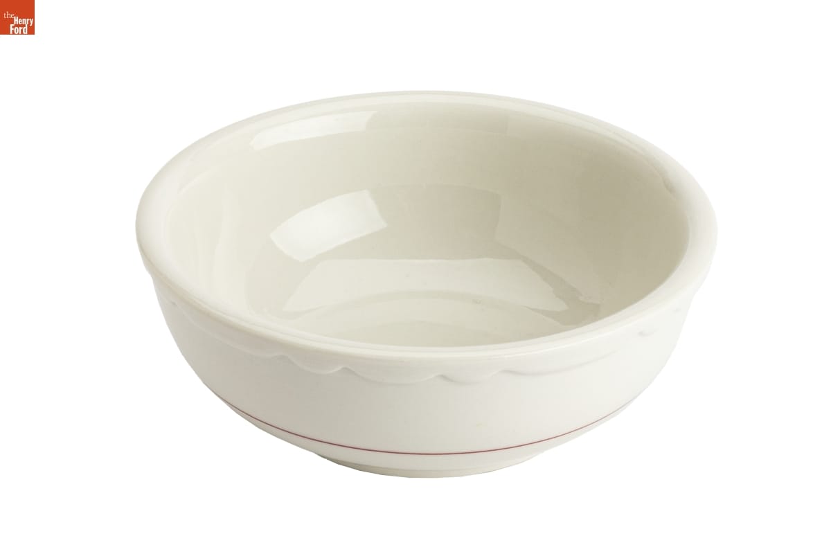 In the 1920s, Howard Deering Johnson began selling ice cream from food stands around Boston, Massachusetts. Johnson later expanded his business to full-service restaurants. He franchised these orange-roofed establishments across America -- locating them along highways to cater to the traveling public. The Simple Simon and the Pieman logo -- seen on this bowl -- became a recognizable symbol to his motoring patrons.