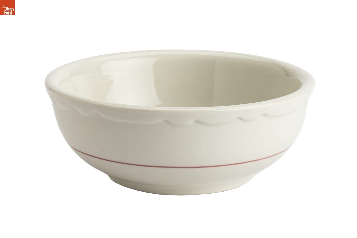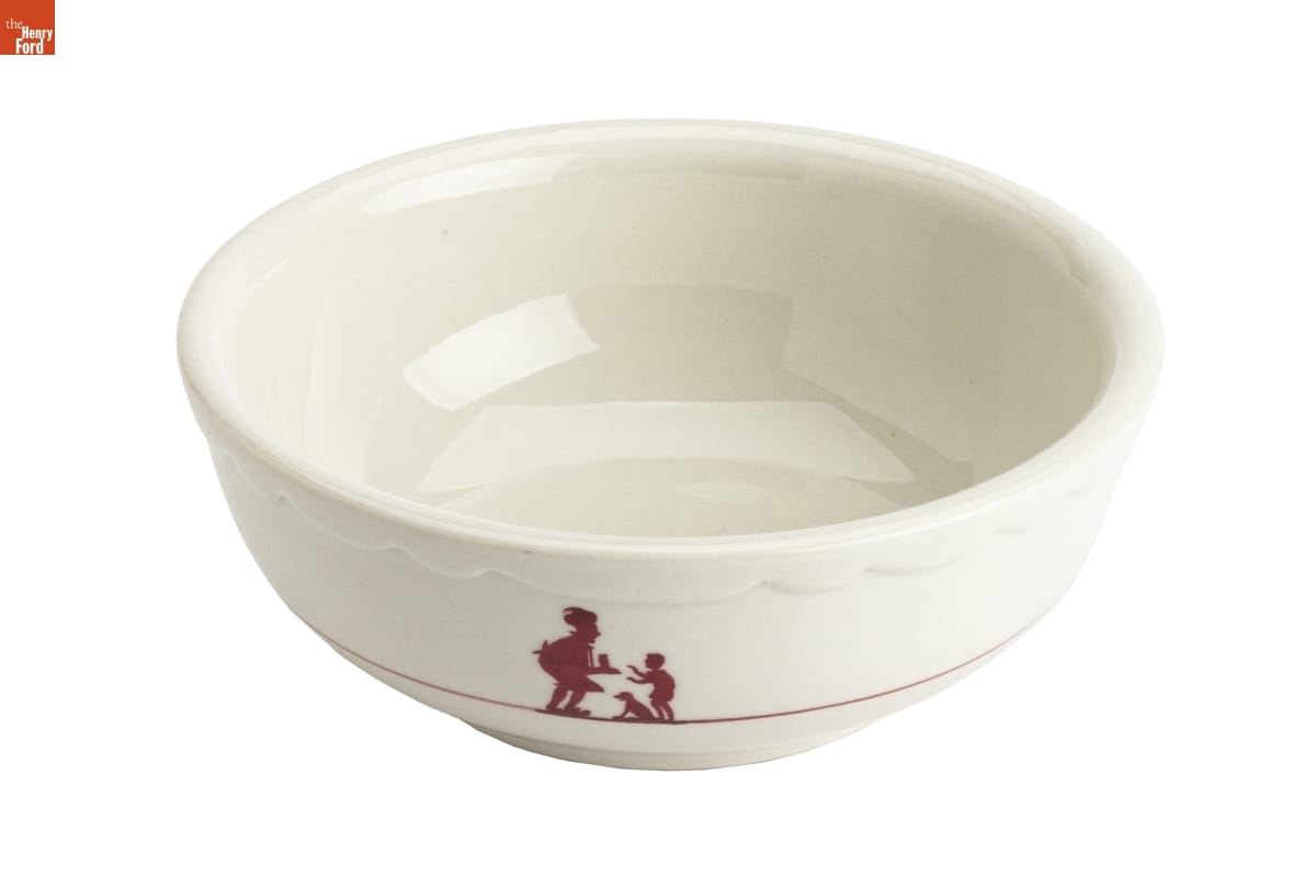 In the 1920s, Howard Deering Johnson began selling ice cream from food stands around Boston, Massachusetts. Johnson later expanded his business to full-service restaurants. He franchised these orange-roofed establishments across America -- locating them along highways to cater to the traveling public. The Simple Simon and the Pieman logo -- seen on this bowl -- became a recognizable symbol to his motoring patrons.